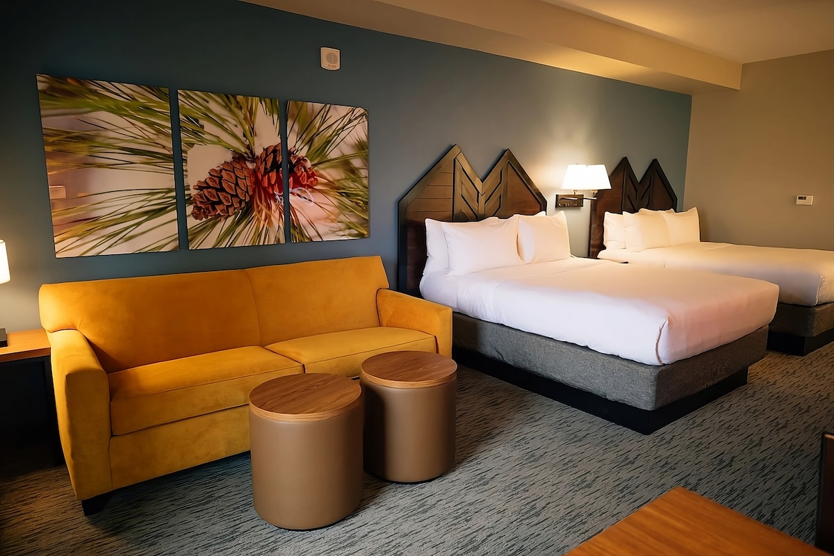 Dos colchones exclusivos Swiftwater Queen con ropa de cama de lujo Frette, TV inteligente de 65 pulgadas, tocadores dobles, ducha de alta presión, batas y zapatillas de felpa, enchufes USB y USB C incorporados, wifi inalámbrico y cableado de alta velocidad de cortesía, controles de la habitación, escritorio, minibar/nevera, caja fuerte en la habitación, vaporizador, secador de pelo, servicios de ducha, estación de café. Servicio de limpieza diario y servicio de firma de Swiftwater. Aproximadamente 350-375 pies cuadrados.