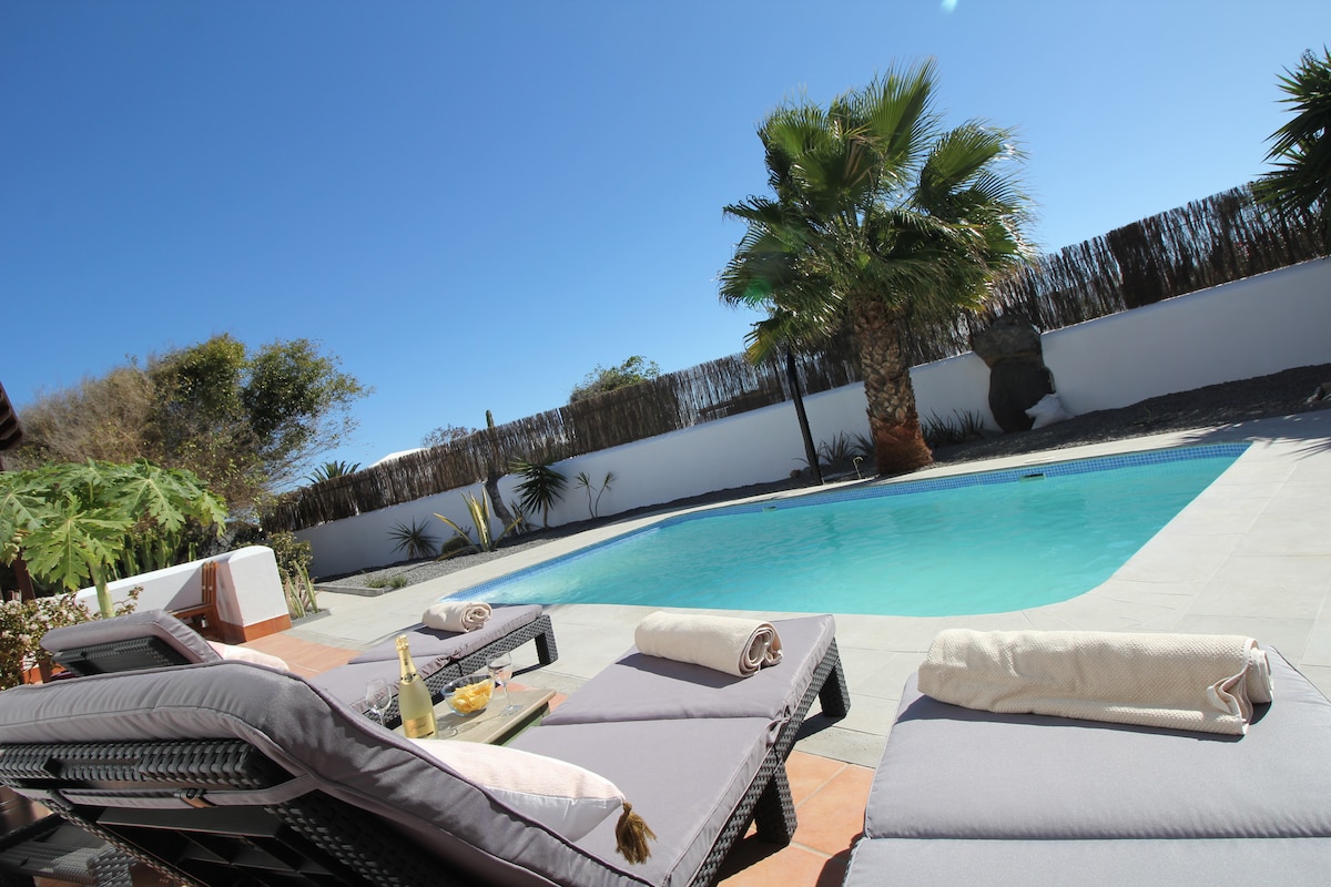 Lujosa villa con total intimidad. Situada en Playa Blanca, rodeada de muros de piedra volcanica y protegida del viento. Vistas al volcan. Mar a 1 kilometro. Piscina climatizada a 28° C y con exposicion Sur. Jacuzzi (36°C). Barbacoa grande Jardin tropical muy lindo. Ducha exterior, terraza cubierta, salon de jardin y tumbonas. Entrada, gran salon, comedor, cocina, 1 habitacion de matrimonio con baño, 1 habitacion con 2 camas y un segundo baño . Parking privado. Smart TV. Wi-Fi 50 Mbps.