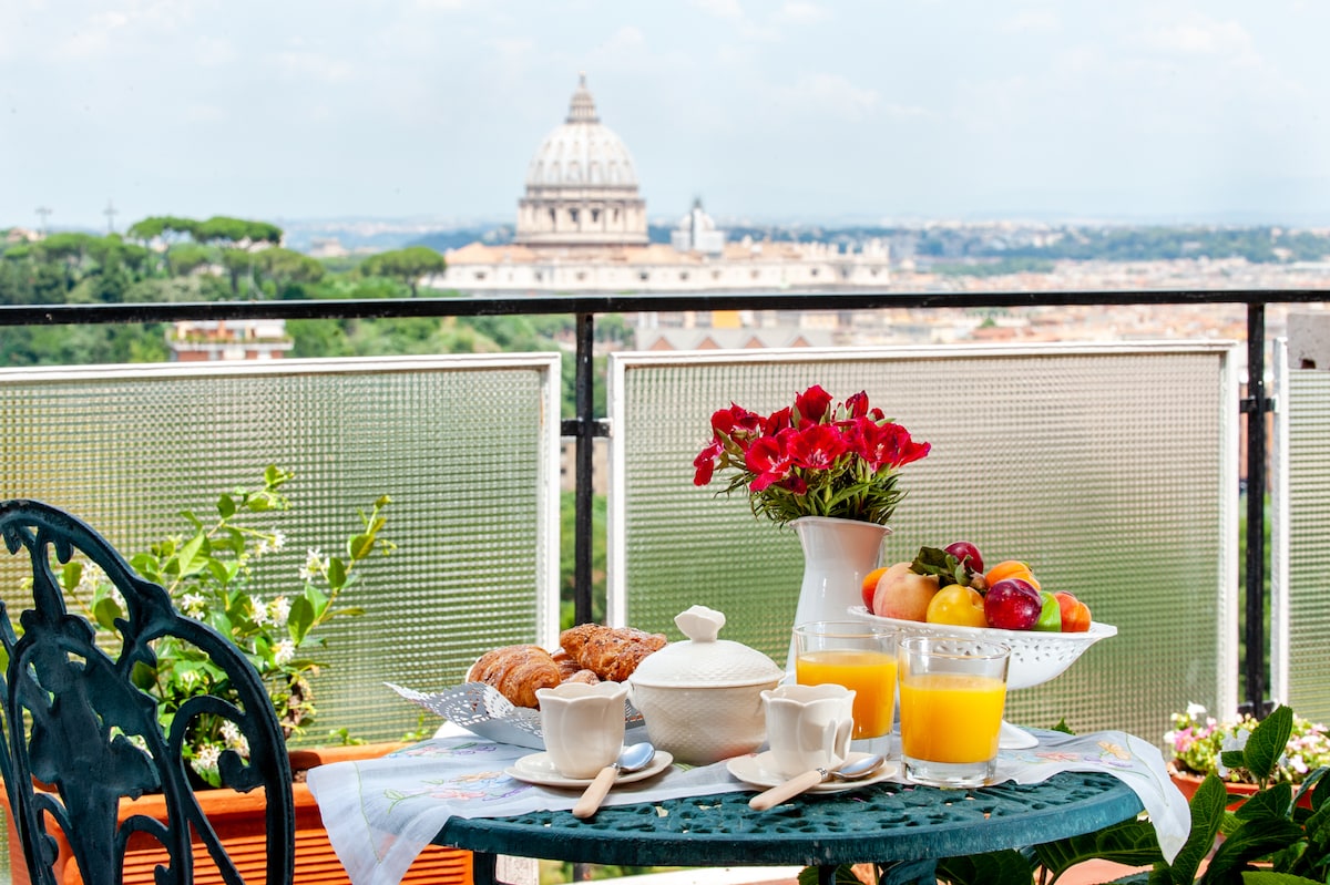 Suite privada exclusiva con un espléndido jardín en la azotea desde el que se puede admirar la impresionante vista de toda Roma y la majestuosidad de la cúpula de San Pedro que domina la ciudad. La suite de esta exclusiva y lujosa ubicación, el mobiliario con finos muebles antiguos, los detalles en puro “estilo italiano” y el incomparable panorama de la ciudad, te harán vivir una experiencia única e inolvidable en Roma.
