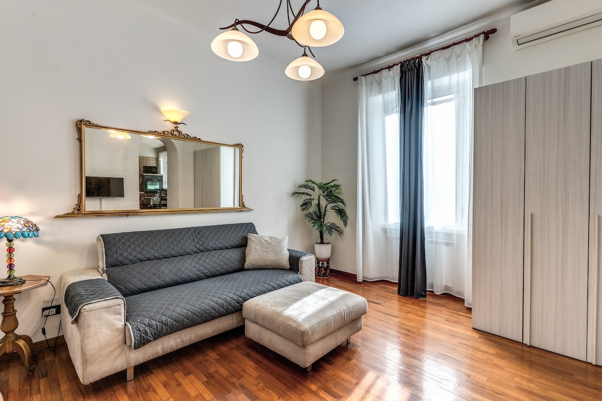 Apartamento recién reformado y espacioso iluminado por el sol en un edificio histórico ubicado en el cuarto piso (con ascensor). Sala de estar/comedor, 3 balcones; 2 dormitorios grandes con 4 camas, baño y cocina completa con horno, lavadora, lavavajillas, microondas. Parqué y pisos originales. Aire acondicionado, wifi de fibra de alta velocidad y TV. A poca distancia a pie del Coliseo, el Foro Romano, el Circo Máximo, restaurantes, metro al aeropuerto y el Vaticano. Cuna disponible bajo pedido por una tarifa adicional.