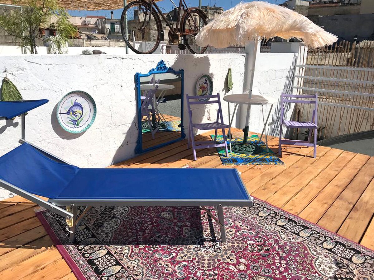 El alojamiento DIMORAdAMARE está situado en el corazón de la costa de Trani, con vistas al mar y a 10 minutos a pie del famoso puerto turístico. La atención al detalle se combina en perfecta armonía con la funcionalidad de nuestro alojamiento, garantizando a nuestros huéspedes una agradable estancia inmersa en los colores y tonos del mar. La espléndida vista panorámica desde la gran terraza se convierte rápidamente en una postal imaginaria para cada uno de nuestros huéspedes.
