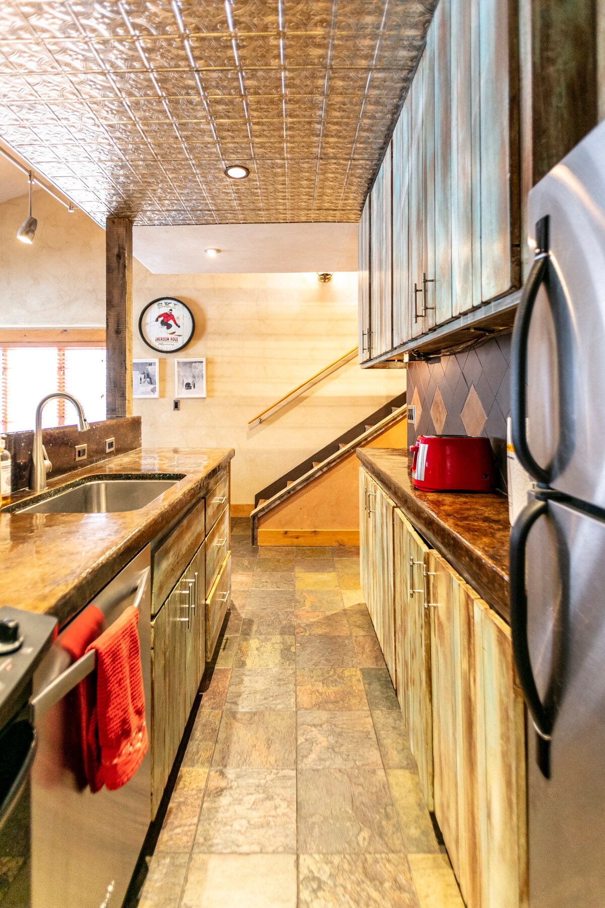 Casa adosada de montaña moderna en una ubicación privilegiada - The Aspens | Bear Berry. ¡Disfruta de tus vacaciones en nuestra casa adosada recién renovada de 2 dormitorios y 2 baños totalmente equipada con tu propia cocina de chef, chimenea de leña y terraza al aire libre con espectaculares vistas a Teton! El Bear Berry se enfrenta a la naturaleza abierta, la cordillera Teton a lo largo de Fish Creek. Renovado con un ambiente de montaña moderna con espacios de estar de inspiración alpina; incluyendo techos abovedados, baños tipo spa, un espacio de trabajo y un acogedor rincón de lectura con vistas.