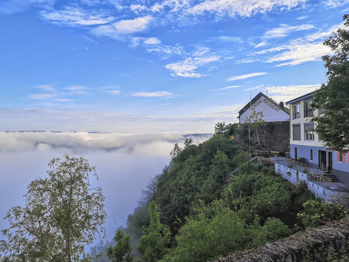 Hemos derribado generosamente los muros del antiguo negocio de los viticultores y ahora puedes disfrutar de la vista panorámica de Mosela. Una maravillosa simbemia de los estándares de vida actuales y el encanto de una posada de montaña. El salón-comedor es de planta abierta, hay un dormitorio con una cama doble y un área separada con un sofá cama. Ya sea tormenta o sol, aquí vives en medio del paisaje del Mosela. De martes a domingo es posible desayunar en nuestra cafetería/bistro. Sauna, alquiler de bicicletas eléctricas
