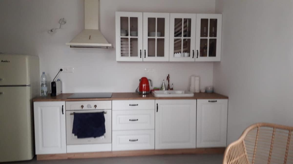 El departamento está en la planta baja de la casa. Consta de una habitación grande, que está dividida por una pérgola en una sala de estar y un dormitorio, una cocina y un baño con un inodoro. El dormitorio tiene una gran cama doble y la sala de estar tiene dos sofás cama. Ropa de cama limpia para cuatro personas disponible de inmediato. La cocina está equipada con electrodomésticos comunes: vitrocerámica, hervidor de agua, nevera, horno, platos y cubiertos. El baño tiene una lavadora con accesorios, toallas y artículos de tocador comunes. EL WIFI en todo el apartamento es una cuestión de rutina.
