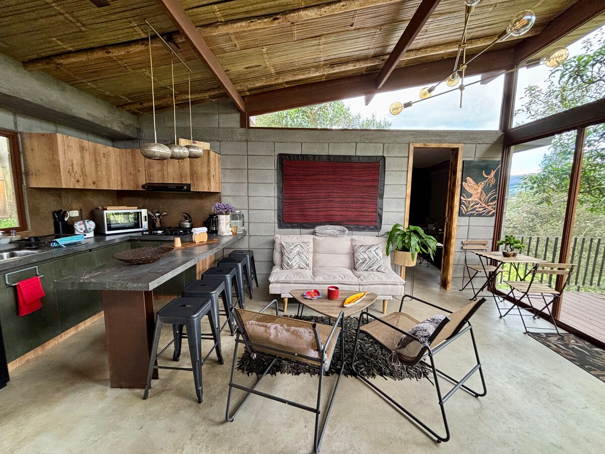 Un refugio cálido y moderno en medio de montañas, de los paramos andinos , rodeado de naturaleza, flores y vistas espectaculares. Esta casa de diseño rústico-industrial combina grandes ventanales, muros de ladrillo y techos de madera para ofrecer una experiencia acogedora y luminosa. Ideal para desconectar, descansar y disfrutar de atardeceres únicos desde la sala o la comodidad de la habitación. Cada rincón ha sido pensado para que te sientas en paz, inspirado y en conexión con el entorno.