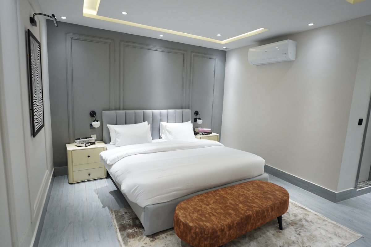 Entra en la comodidad refinada. Nuestra suite Boutique Luxe combina una estética suave, una iluminación cálida y un diseño atemporal, todo en Kashmir Point, justo en Main Bank Road. Disfruta de servicio de limpieza las 24 horas, los 7 días de la semana, estacionamiento seguro, una barbacoa en vivo en la azotea y un cine privado íntimo bajo las estrellas. Con un restaurante en el último piso, cada momento se siente curado, acogedor y bellamente lujoso.