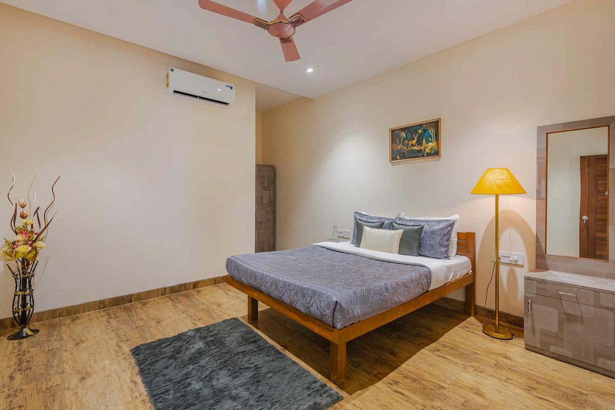 El centro vacacional Blue Sky se encuentra cerca de la serena playa de Varsoli, la playa más cercana de Alibag El espacio se destaca por brindarte una experiencia costera, hermosa, pintoresca, seductora y encantadora durante tu estancia con nosotros que hará que sea tu mejor casa de vacaciones. Estas habitaciones dobles bellamente decoradas, que abarcan aproximadamente 180 pies cuadrados, ofrecen un refugio sereno para dos. Cada habitación está diseñada con una decoración refinada, una lujosa cama doble y un baño privado, perfecto para aquellos que buscan comodidad con un toque personal.