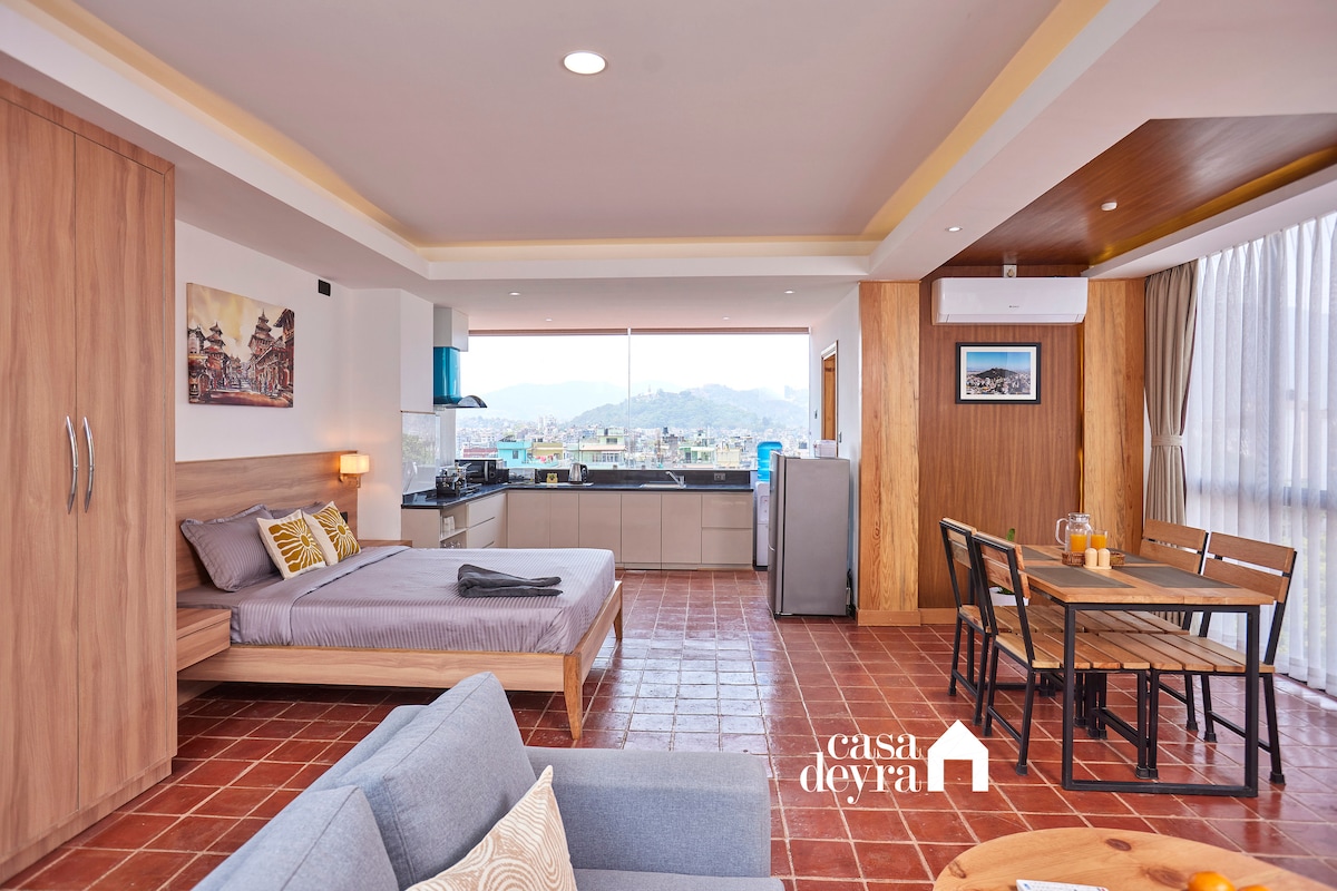 Despiértate con los amaneceres del Himalaya en este luminoso y hermoso apartamento estudio, donde las ventanas del piso al techo enmarcan las vistas panorámicas. Ubicada en los pisos superiores para mayor privacidad, esta unidad ofrece una vista impresionante del Swayambhu Nath a través de grandes ventanas, combinando la energía urbana de Katmandú con la serenidad natural. Disfruta de comodidades modernas como TV inteligente, aire acondicionado y cocina con electrodomésticos de primera calidad.