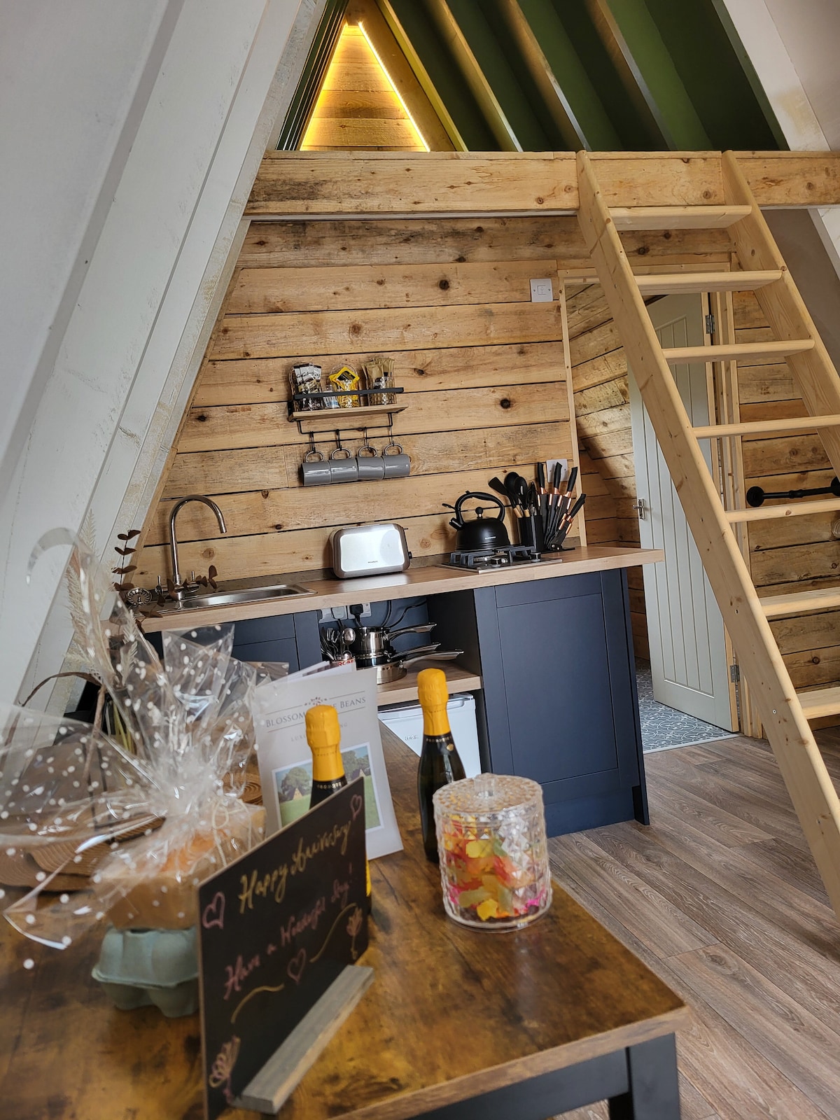 Saldrás de la tranquila carretera rural, subirás por el camino de la granja y llegarás a Top House Farm, donde te esperan tu Shepherds Hut, jacuzzi y cabaña de barbacoa. La cabaña de pastores, recientemente reformada, contiene una cama tamaño king, cocina pequeña, comedor y baño con ducha. La bañera de hidromasaje está lista a tu llegada y la cabaña de barbacoa es el mejor lugar para pasar la noche alrededor del fuego.