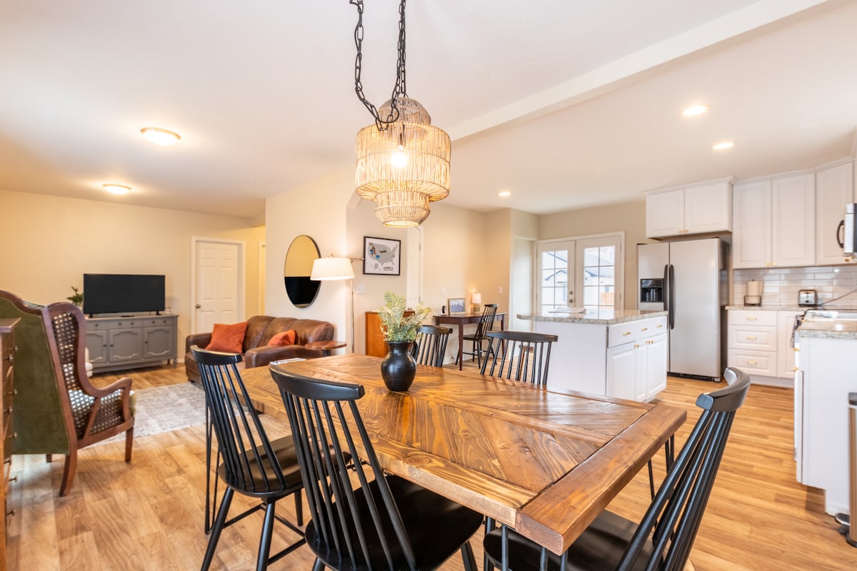 The Modern Farmhouse was recently remodeled with upscale amenities and everything you need for a comfortable stay! Enjoy your own delicious home cooked meals in the beautiful kitchen, gather in the dining room with seating for 8, enjoy a movie on Netflix or Disney+ on a huge 65" OLED 4K TV and 7.2 Klipsch Surround Sound with a large sectional providing seating for the whole family. Outside on the back patio you will find outdoor seating with a fire pit, a hot tub for 5, and a 6 burner BBQ.