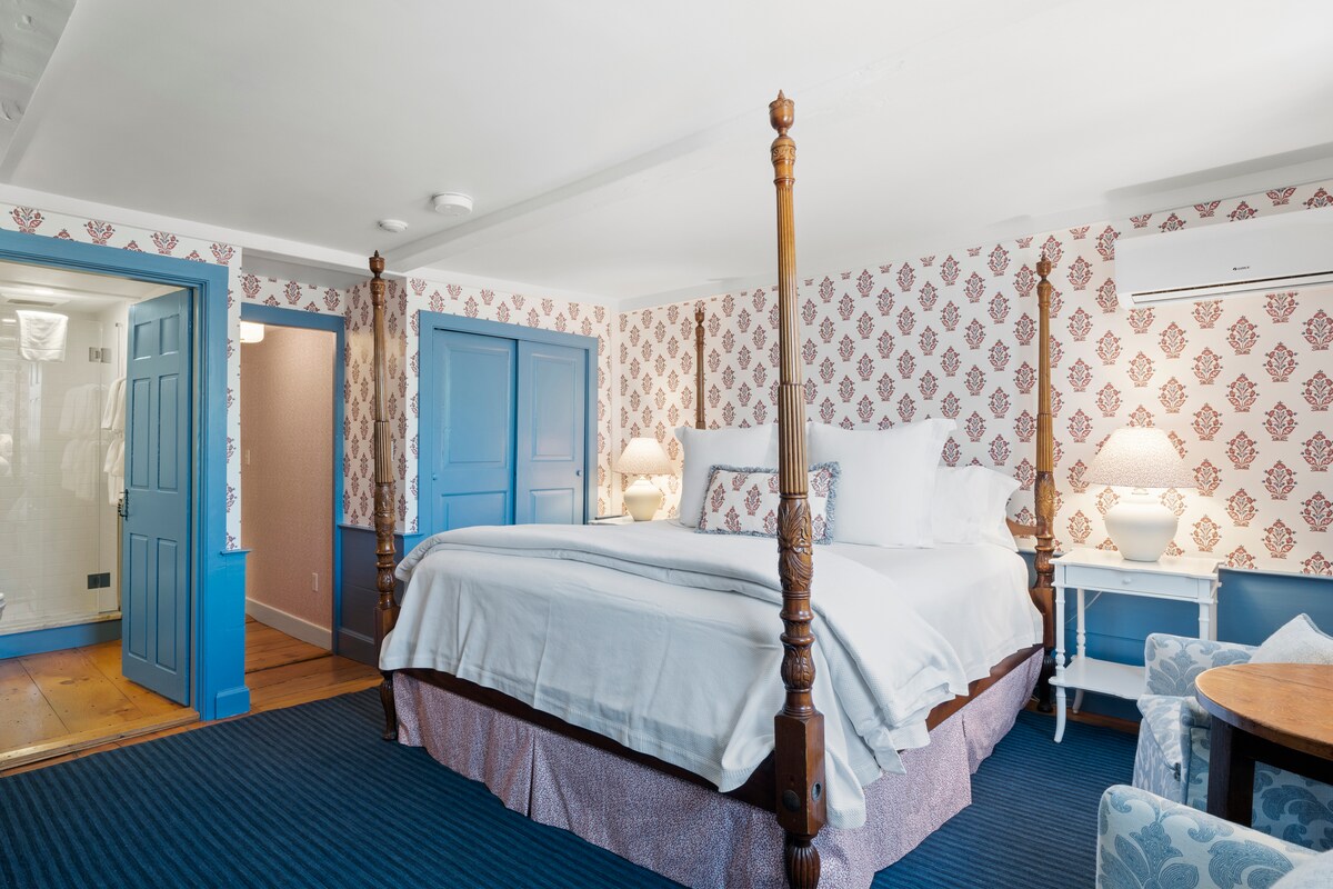 - 29 India St, en el corazón de Nantucket. - No se admiten bebés ni niños menores de 10 años. - Habitación tranquila. - Limpieza diaria. - Cama tamaño king y 2 camas individuales. - Baño privado moderno en suite. - Amplio, con aire acondicionado. - Un amplio armario. - 2 ventanas (mucha luz natural y aire fresco). - Casa histórica con exquisitas antigüedades y muebles. - Auténtico encanto histórico. - Generoso desayuno servido en el comedor. - Ubicación ideal cerca del puerto y de la calle principal. - Hermosos jardines y patio.