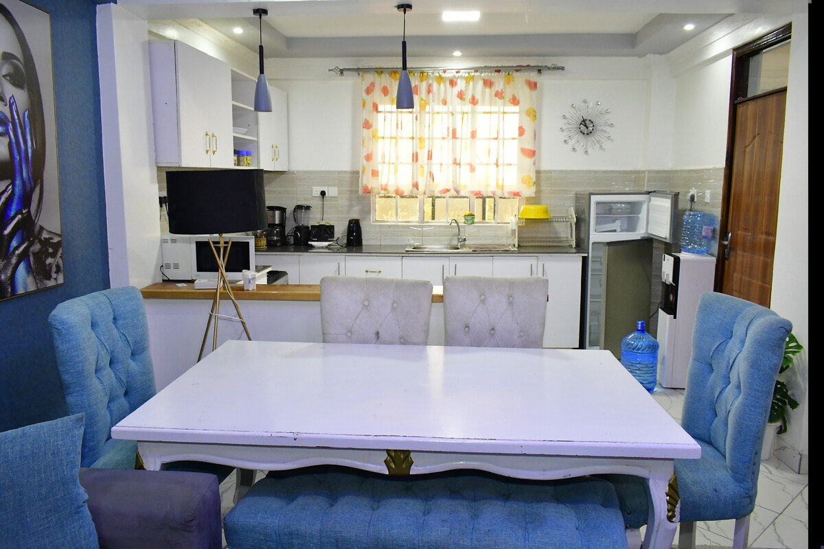 Bienvenido a tu escapada tranquila en Nanyuki, un apartamento de 2 dormitorios bellamente amueblado diseñado para la comodidad, el estilo y la relajación. Situado en un barrio tranquilo a pocos minutos de Cedar Mall, Coffee Bench y otros restaurantes de primera categoría, es la base perfecta para explorar Nanyuki y sus impresionantes alrededores.