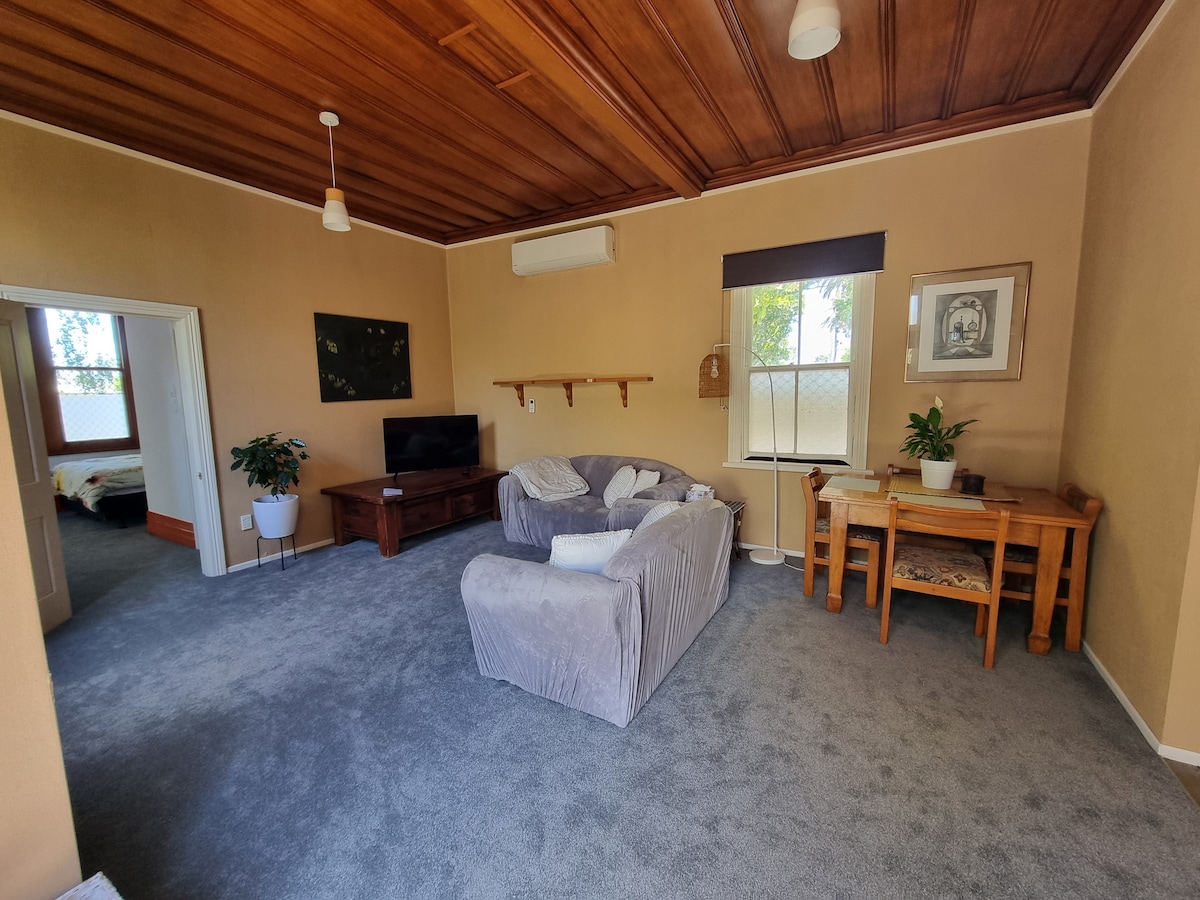 Ten minutes walk to town..very spacious..suits families..and late checkins. Retro, not for people who like flash hotels or new things. Come here if you want something different. Relaxing..away from traffic..off street parking...Separate bedroom and kitchen and bathroom..lounge too..flat access. We welcome diversity. Children under 17 are free. So don't count them on the booking as Airbnb charges. We aim to be friendly and kind. Raelene or Hilary are your hosts.