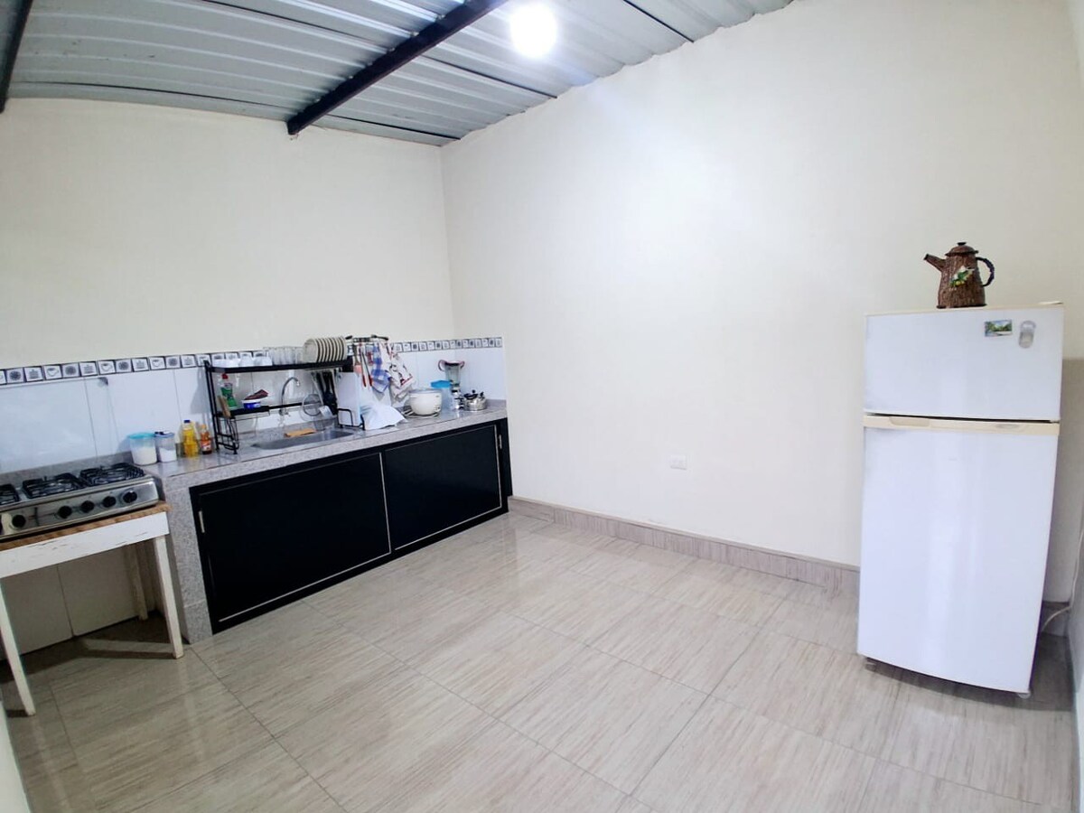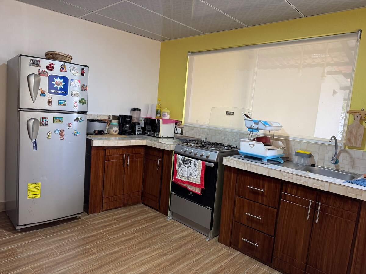 Charming family estate in La Merced — comfortable, private, and secure — ideal for families or events of up to 15 people (sleeps 4). Just 5 min from fishing, farms, and trails, and 10 min from the medicinal hot springs of Ilaló and La Merced. Enjoy BBQ with charcoal and utensils, swing, garden, karaoke, board games, and private parking for up to 4 vehicles. We offer breakfast at an extra cost (continental, Montubio, or ranchero). Nature and comfort in one place.