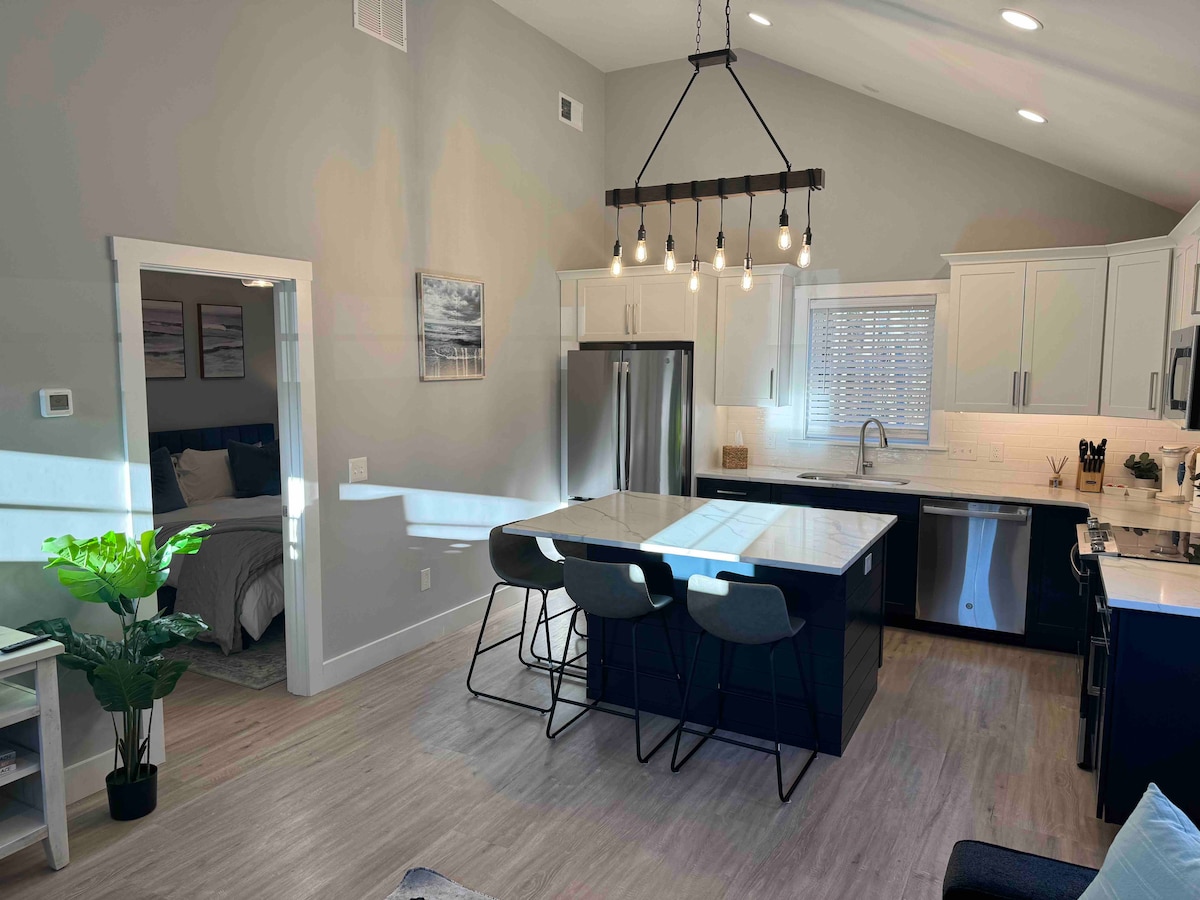 Cabaña estudio simplemente adorable. 216 pies cuadrados. Aire acondicionado y calefacción centrales, cocina con estufa, horno, refrigerador, fregadero y gabinetes. Equipado con platos, platos y utensilios de cocina. Zona para comer con mesa de hojas sueltas. Cómoda cama doble de espuma viscoelástica con contenedores de almacenamiento debajo. Baño con ducha y puerta de bolsillo. Una ducha al aire libre para un enjuague fácil después de la playa también. No se permite fumar en las instalaciones. 2 plazas de estacionamiento en la propiedad; NO SE PERMITEN BARCOS, VEHÍCULOS RECREATIVOS/REMOLQUES EN LA PROPIEDAD. No hay estacionamiento en la calle. No hay velas. RE-01712-STR