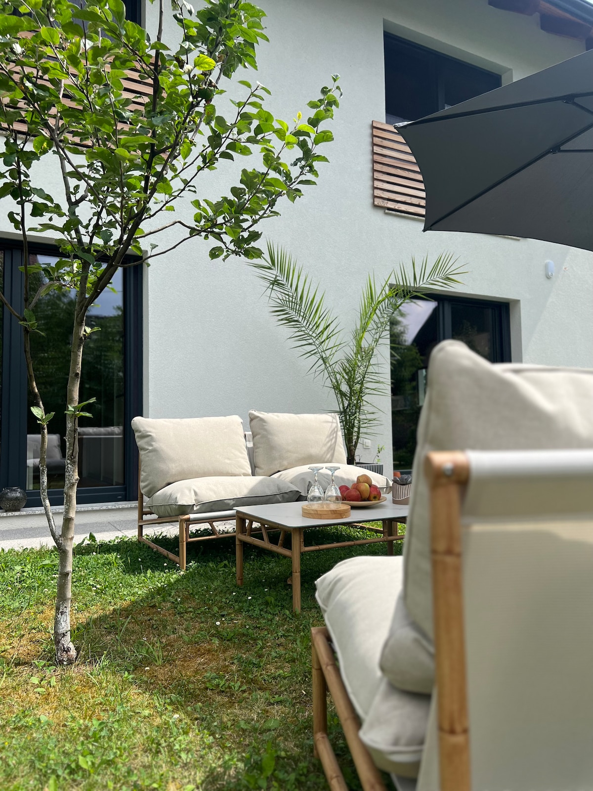 Our 2 bedroom apartment with 1 bathroom, kitchen, spacius living room with couch and dining table, A/C, and spacius patio is located just around 100 meters from Lake Bled (swimming area). It's located in very peaceful area. It has it's own entrance and is located in our house (so we're always nearby to help). We're a family of 5 and will be happy to host you. Sustainability: We produce more energy than we use. Tourism tax (3,13 for adults per day, 1,56 for children above 7) is not included.