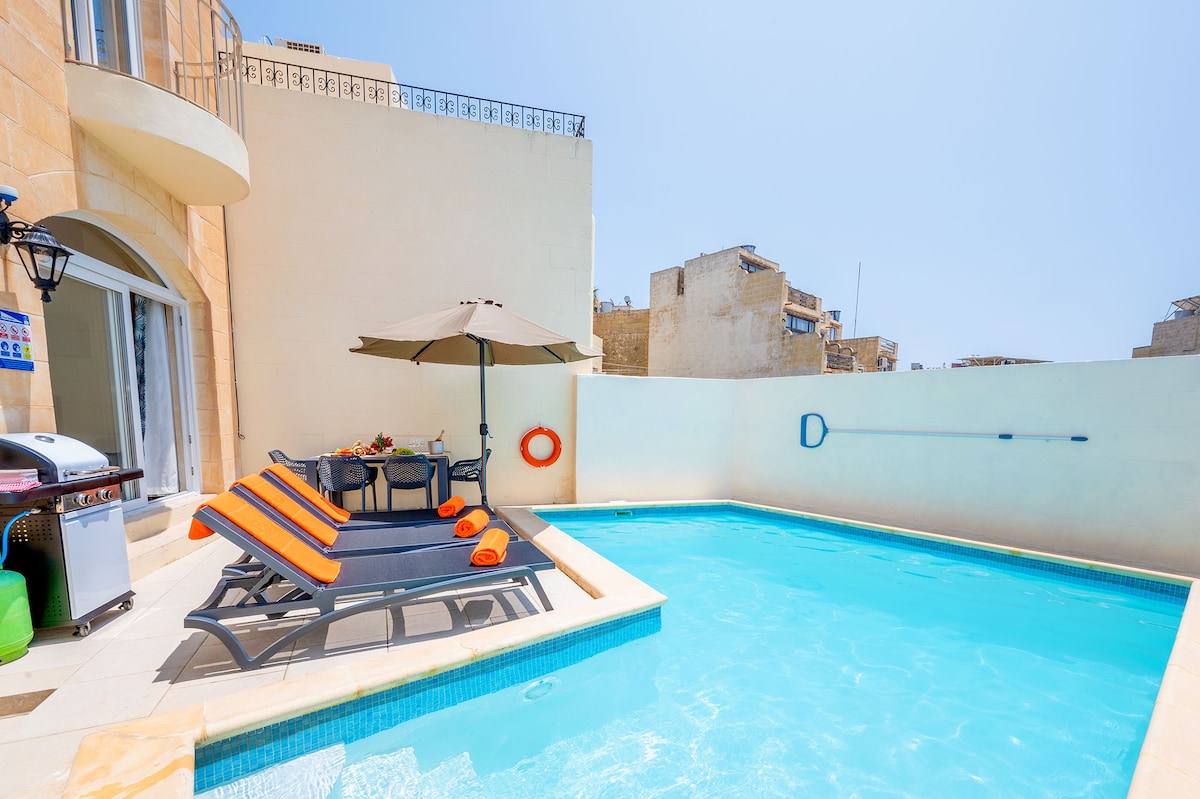 Escápate al tranquilo entorno de Gozo en nuestra villa única de 300 años con características de carácter originales y 2 piscinas. Los huéspedes disfrutan del uso privado de las piscinas exteriores e interiores (spa) y de la barbacoa/comedor en la azotea iluminada con una mesa para 10 personas. El encantador interior está equipado con cocina completa, lavavajillas, aire acondicionado, Smart TV 4K, WiFi y mesa de air-hockey. La base perfecta para una escapada relajante, privada y aislada, a poca distancia del bullicioso casco antiguo.