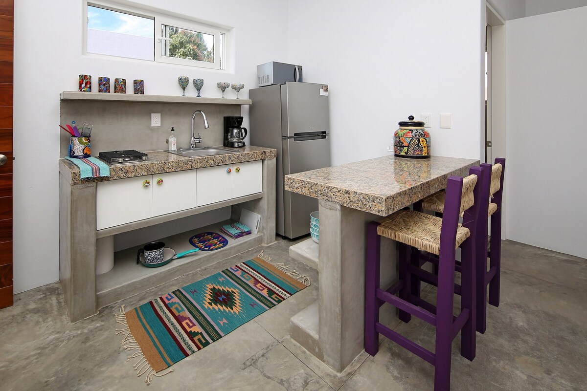 Bungalow moderno, tranquilo, con mucha luz y un pequeño patio (no hay alberca). Situado en un vecindario tranquilo (carros y motos pasan por la calle, puede ser ruidoso), seis minutos caminando hasta la plaza, de ahí, un minuto más hasta la playa principal. Limpiezas incluidas durante su estadía! Internet 50Mbs bajada, 20Mbs subida (alcanza para video conferencias etc.)