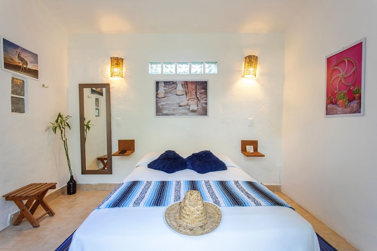 Very small, cozy unit with one Queen bed. It is surrounded by garden at the far back of our property with 6 more units in the front part that all together make up our "Sayulita Oasis". It has a private en-suite bathroom. Please note that it does not have a kitchen / fridge. Feel free to use the small, shared dipping pool in the front area. Also, please look at the last photo. It shows and describes the layout of the whole property and all it's casitas and common areas like pool or gardens.