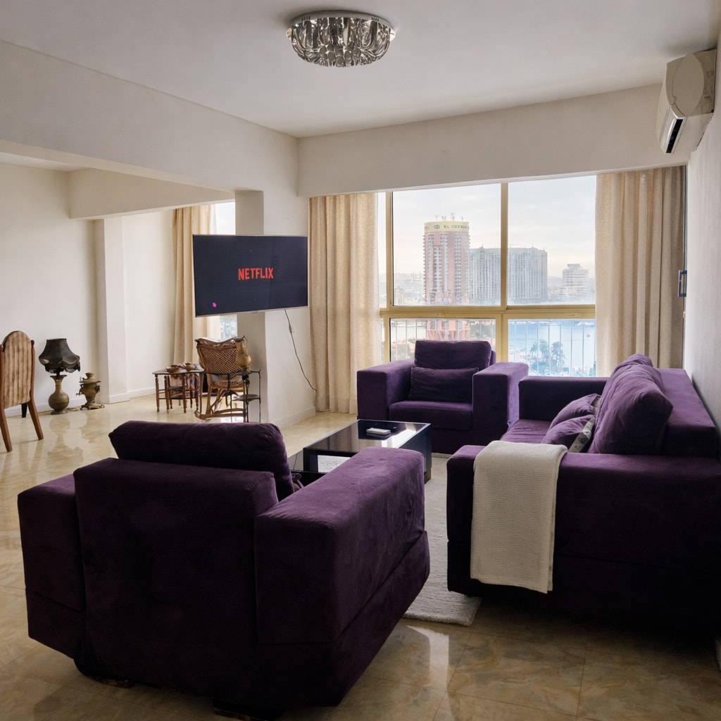 Descubre nuestro impresionante apartamento de 2 dormitorios en el corazón de El Cairo, que ofrece vistas panorámicas abiertas al Nilo y muchos lugares emblemáticos con interiores relajantes y amplio espacio. Ya sea que estés explorando los museos, paseando por el Nilo o disfrutando de los vibrantes mercados locales, este apartamento será tu hogar perfecto para una experiencia inolvidable en El Cairo.