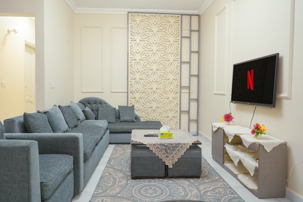 Alójate en el corazón del 5.º asentamiento de Nueva El Cairo en este elegante departamento de 3 dormitorios, ideal para familias, grupos y estadías largas. Cama tamaño king, cama tamaño queen, cama individual, sofá cama y cuna. Balcón privado con vistas a un jardín tranquilo. Aire acondicionado en toda la vivienda, wifi de alta velocidad, Netflix, Shahid VIP y YouTube. A minutos de Cairo Festival City, 5A, The Drive, U Venues, 90th Street, EIEC y los mejores hospitales. ⚠️ Nota: El departamento está en el segundo piso y no hay ascensor.