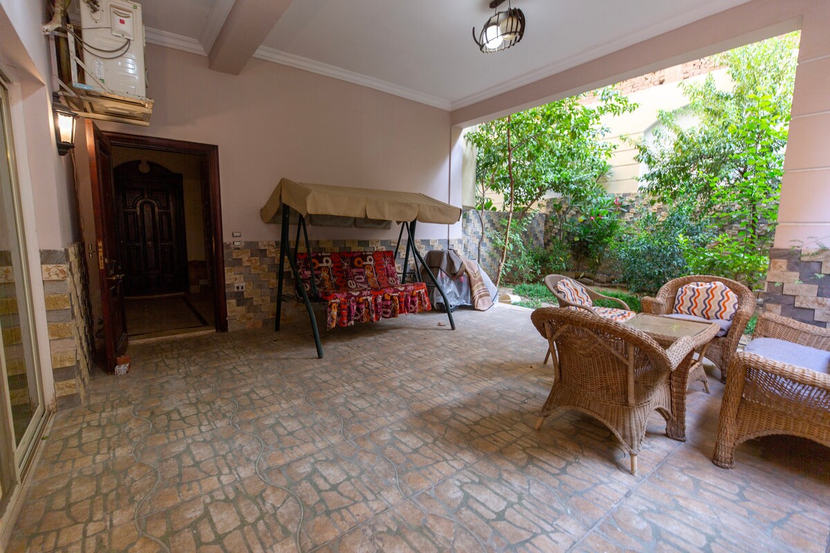 La casa Boho tiene un increíble jardín espacioso. Tu familia estará cerca de todo cuando te hospedes en este lugar céntrico, en la zona de Chowayfat. A cinco minutos de 5A por el centro comercial Waterway, a siete minutos del parque médico y de todos los centros médicos, a ocho minutos del centro comercial Cairo Festival City.