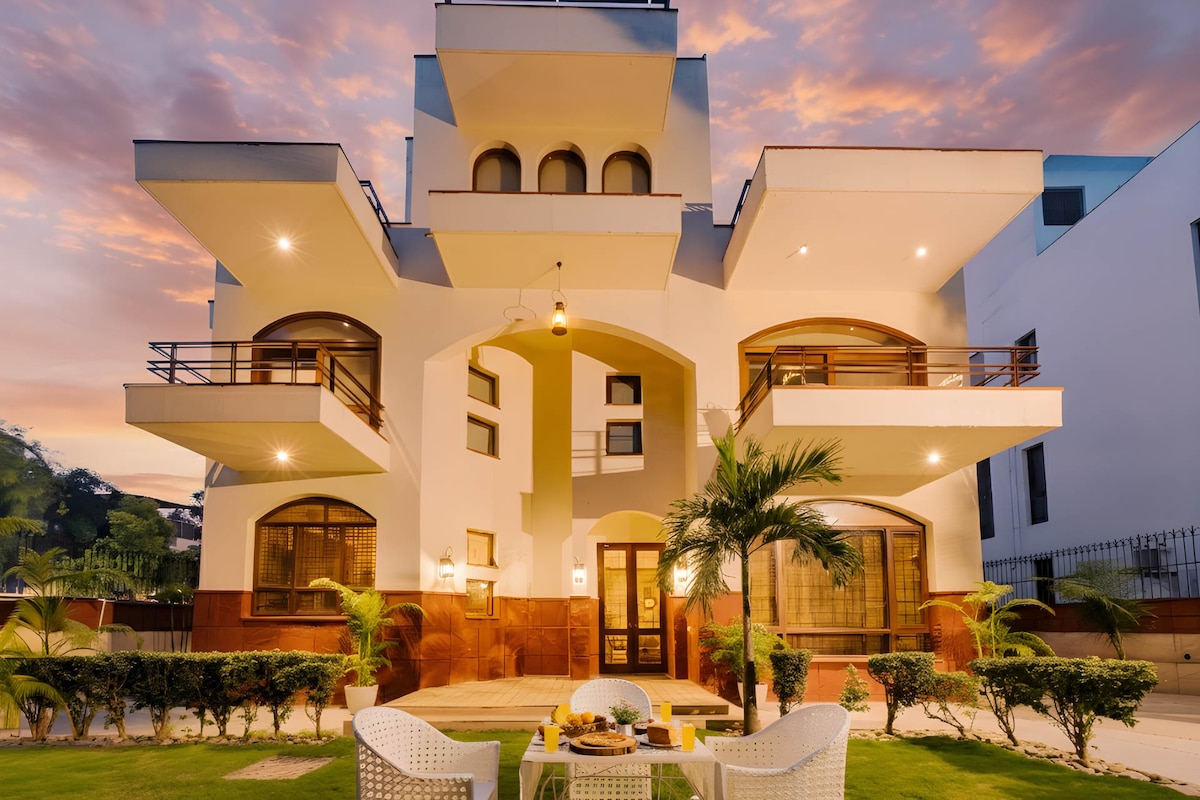 Villa de ◆ 4 dormitorios con dos salas de estar y una elegante cama loft. ◆ Atracciones cercanas: Parque ✔ de la biodiversidad de Aravali: 2,0 km Centro comercial ✔ Ambience – 6.8 KM ✔ Cyber Hub – 7 km Aeropuerto Internacional de ✔ Indira Gandhi: 16,6 km ◆ Disfruta de noches de cine en el cine en casa con cómodos asientos, aire acondicionado, pantalla grande y sonido inmersivo. Sala de ◆ juegos con mesa de billar y mostrador de bar, perfecta para noches divertidas. ◆ Terraza con vistas a la ciudad, ideal para relajar las puestas de sol.