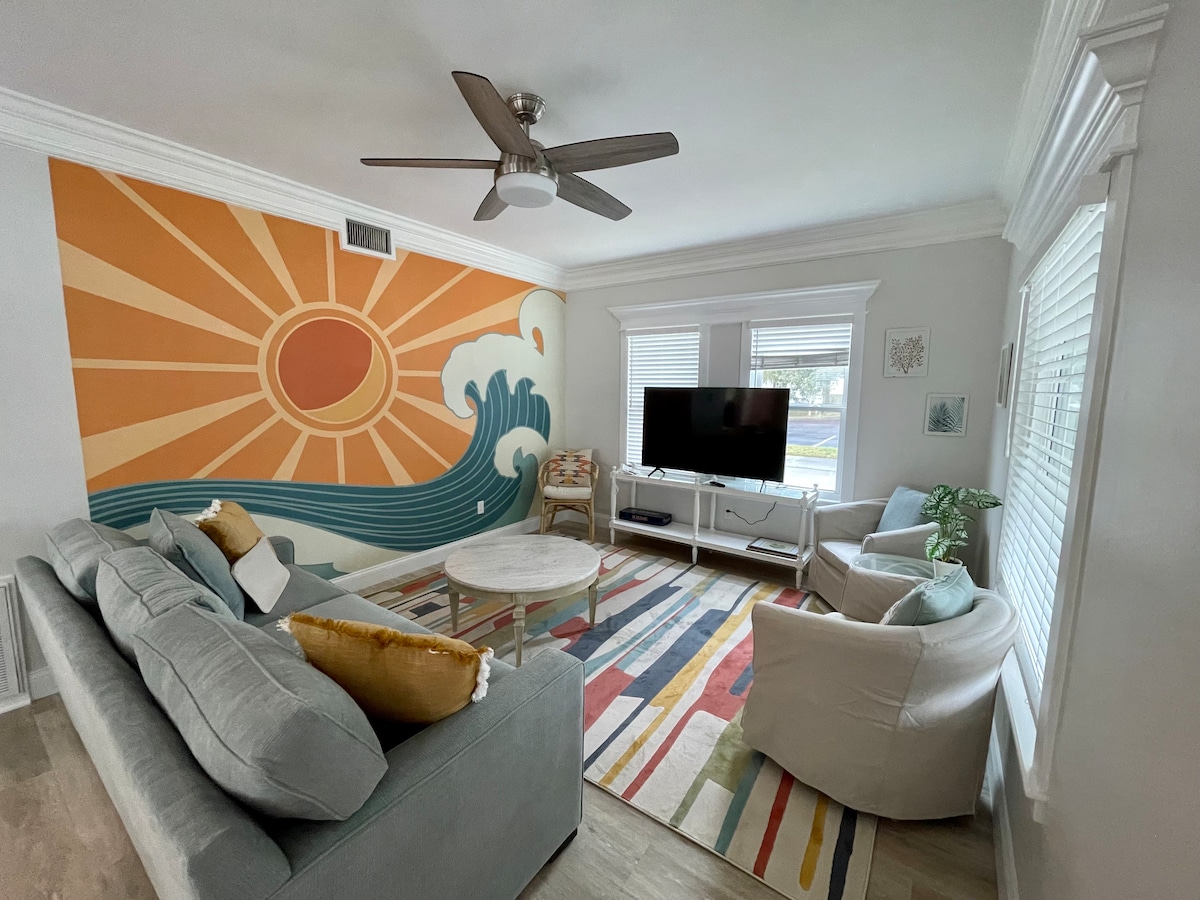 Welcome to our vibrant 1950's Palm Beach style beach house in New Smyrna Beach, just a 2-minute walk to the beach and 5 minutes to Flagler Avenue’s shops and restaurants. Enjoy our large private porch, shared pool and hot tub, and a lush, private veranda. Our family-friendly home offers all beach essentials and is perfect for couples or groups up to 4. . Guests love the unique decor, top-notch appliances, and unbeatable location. Book now to experience a charming and colorful stay!