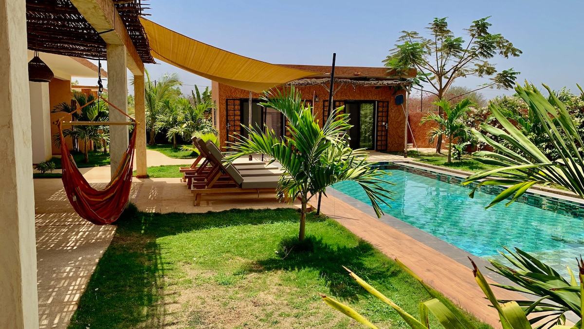 Venga a relajarse con los amigos o la familia en esta hermosa villa nueva con piscina y jardín. La Villa está en una pequeña residencia de algunas villas independientes en el corazón de Ngurigne a 10 minutos de hermosas playas. La villa de una sola planta está decorada con cuidado y también tiene un pequeño bungalow independiente. Numerosas actividades cercanas como AccroBaobab, el parque de aves, el parque de Bandia (Safari) o las playas de Saly y Somone.