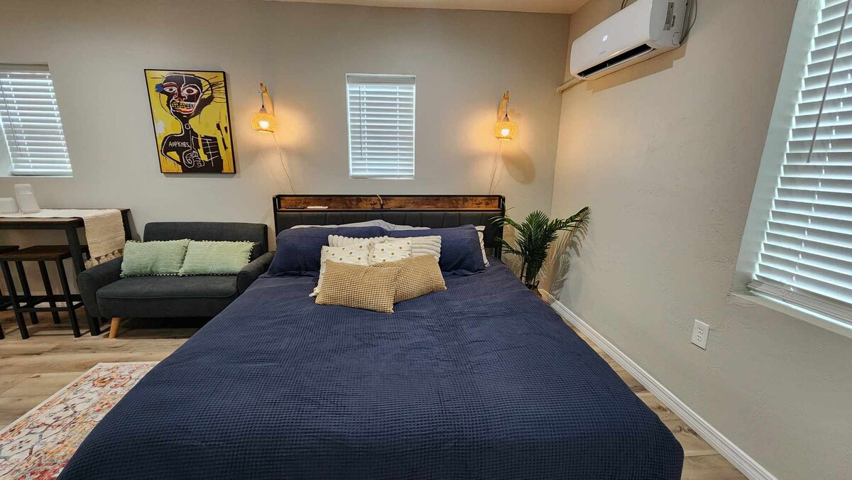 ¡Ven a disfrutar de nuestra casa de huéspedes en el patio trasero, con una ubicación céntrica para disfrutar de los mejores lugares locales de OKC! Este estudio de un dormitorio (250 pies cuadrados) ha sido cuidadosamente diseñado para pensar en todo lo que puedes necesitar para una estancia relajante: ¡café, aperitivos, ropa de cama cómoda y mucho más! Esta casa de huéspedes está escondida detrás de nuestra casa, lo que ofrece mayor seguridad. Ocupamos la casa principal y el patio trasero. Tenemos un gran danés amistoso (Winston) que está bien educado y es vigilado mientras está afuera. El acceso a la casa es a través de un camino de entrada.