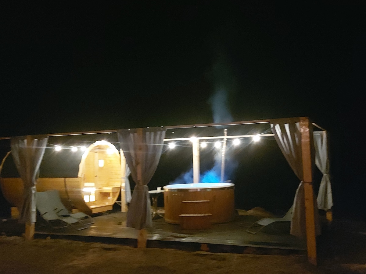 Una moderna casa de troncos con bañera, chimenea, fogata