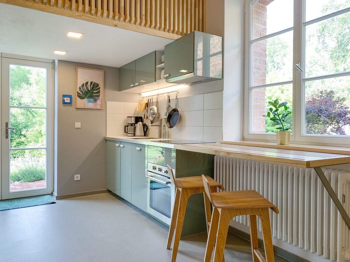 Diseñada con cariño, la mitad de una casa con su propia entrada y área de jardín, ubicada en una zona tranquila y rodeada de naturaleza. En unos 70 m², te esperan dos dormitorios con camas dobles, un baño con bañera y ducha y una acogedora sala de estar con comedor. La moderna cocina está totalmente equipada con horno, lavavajillas y nevera, ideal para parejas, familias o habitantes de la ciudad que buscan paz y tranquilidad.