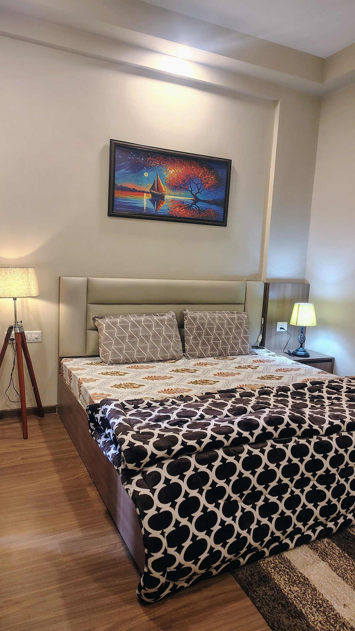 Disfruta de una estancia que combine un diseño moderno con una comodidad acogedora en Sandane Homes. Esta habitación de diseño ofrece interiores elegantes y servicios cuidados, perfectos para una escapada elegante pero relajante en Greater Noida.