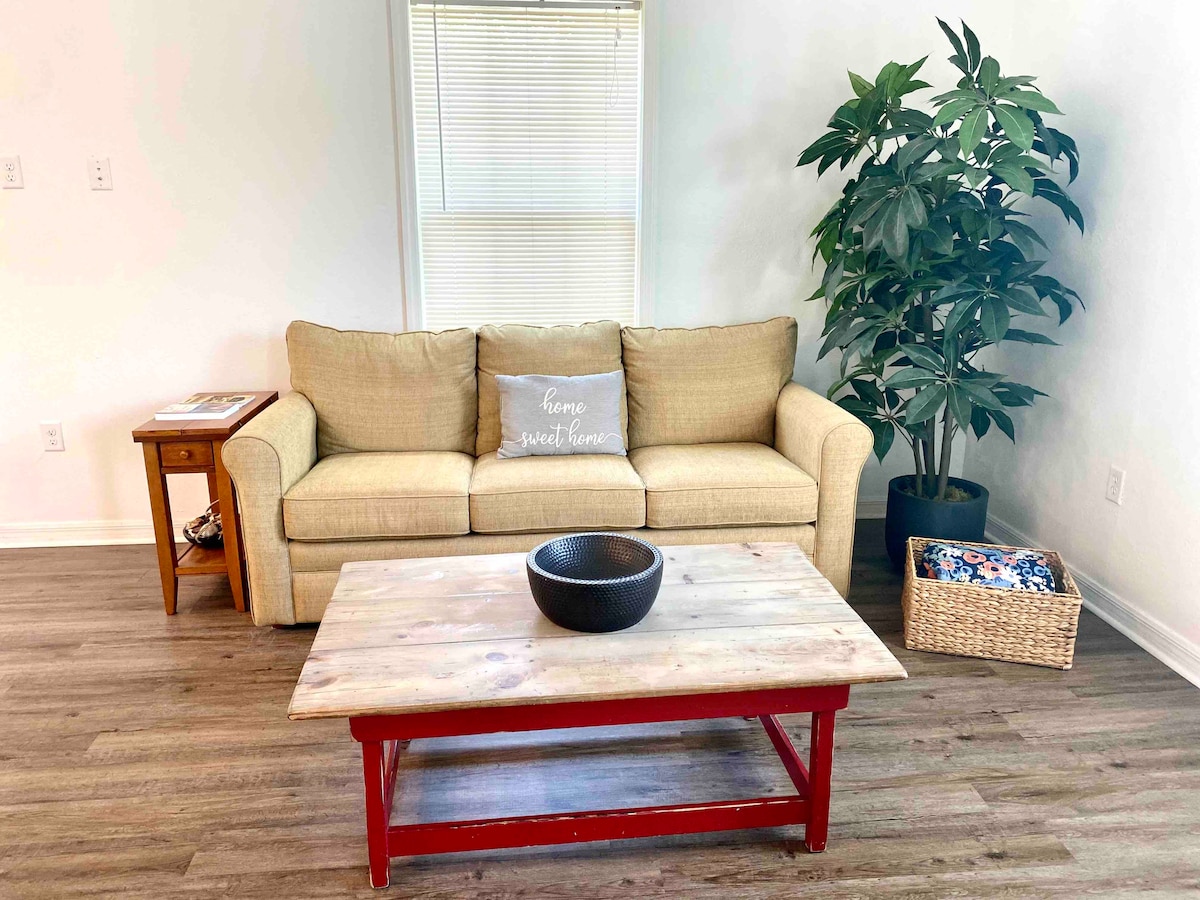 ¡Hermoso loft de nueva construcción que ofrece 640 pies cuadrados de planta abierta! Esta unidad se encuentra encima de nuestro garaje para dos coches, a 130 pies de la casa principal. ¡Cocina completa, microondas, cafetera, tostadora, plancha y lavadora/secadora! Nuestra casa se encuentra en 1,14 acres con una entrada circular en un barrio muy tranquilo. Disfruta de huevos frescos de granja orgánica cuando las gallinas estén poniendo. Si tienes hijos, puedes jugar en la «isla» (nuestra zona de juegos para niños) con una casa de juegos y una cúpula para escalar. ¡Un lugar muy relajante!