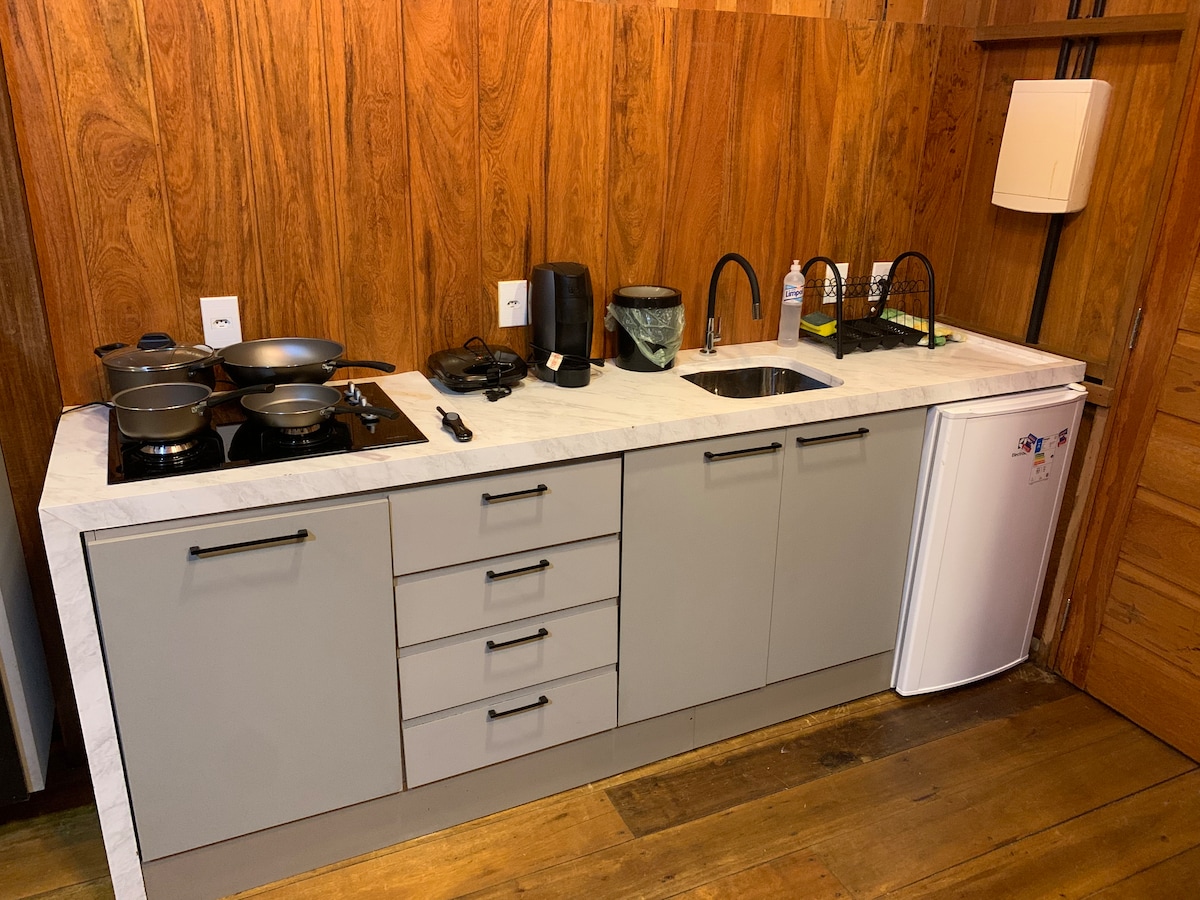 Construimos Grotinha para que fuera nuestro refugio :) El espacio está bien integrado con la naturaleza y es muy cómodo para pasar una temporada. La casa de campo está bajo los árboles y junto al arroyo Tapuio. Se encuentra a 1,5 km de la ciudad y cerca de algunas cascadas. La región está muy conservada con fauna y flora sensibles, necesitamos cuidar y estar siempre atentos a la naturaleza.