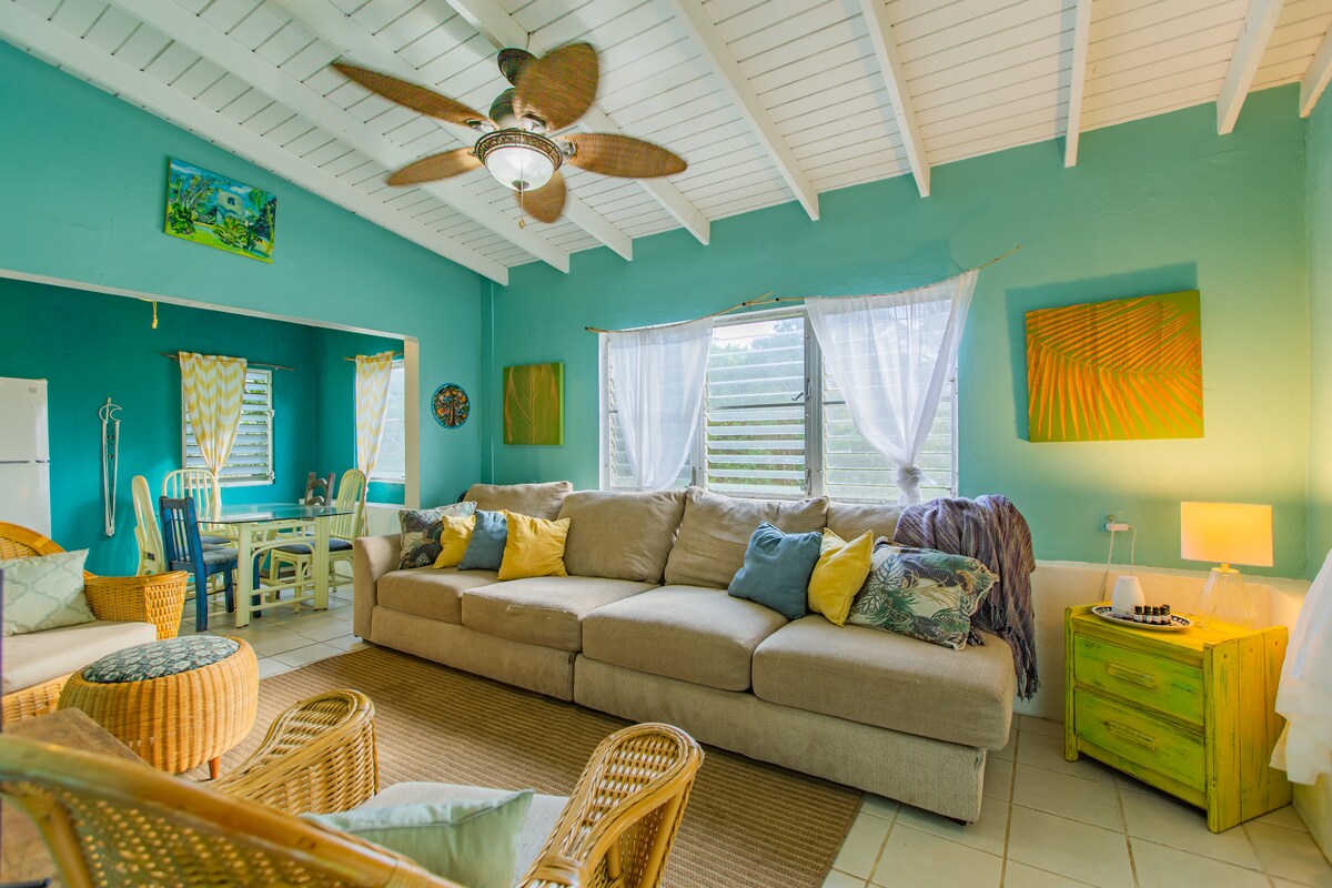 Escápate a esta elegante suite de invitados en el centro de casi un acre de tierra tropical con palmeras susurrantes y árboles frutales. Este estudio recientemente renovado incluye una cocina completa (¡con condimentos para sazonar!) y un tranquilo patio compartido con parrilla. Respira la brisa del Caribe, relájate bajo las estrellas y disfruta de nuestra propiedad 420-friendly, solo que no fumes en el interior, por favor. Ideal para parejas, viajeros solitarios o cualquier persona que busque paz, comodidad y un auténtico ambiente isleño.