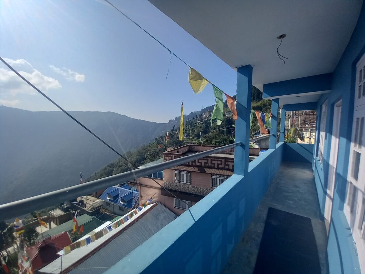 Una suite loft de 1000 pies cuadrados con terraza privada, cocina totalmente equipada y baño adjunto. La propiedad tiene una vista de 360 grados de la ciudad de Kalimpong con 'Delo', la colina más alta hacia el norte, Durpin Dara hacia el sur y el valle del río Relli hacia el este. La propiedad tiene vistas a la cordillera oriental del Himalaya.