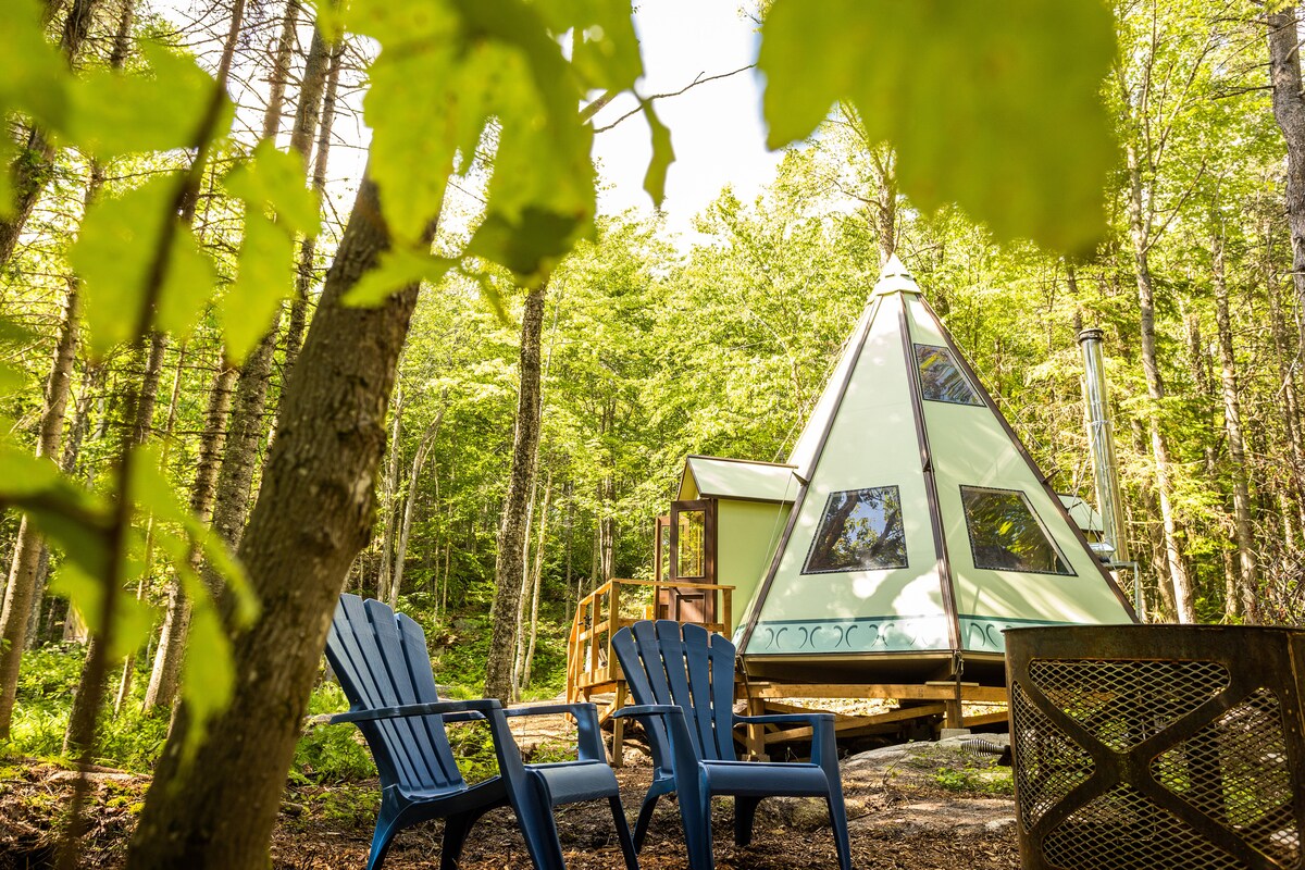 Majestuoso tipi privado frente al mar * en un lago. Oasis tranquilo en la naturaleza con jacuzzi, estufa de leña, chimenea, parrilla moderna y todos los elementos esenciales. Patinaje sobre hielo o xc-ski al otro lado del lago congelado y observa a las águilas calvas volar por encima, o relájate en las sillas Adirondack frente a la hoguera mientras haces olores y cocinas la cena en la parrilla o sobre el fuego, luego acurrúcate dentro del tipi mientras escuchas un vinilo vintage y dejas que los búhos te hagan dormir. *Tipi cerrado de marzo a abril.
