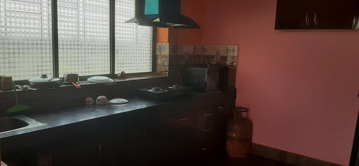 1 bhk, planta baja en casa independiente. Nuestro hogar es ideal para familias, amigos y parejas casadas que buscan una estancia tranquila y cómoda. Alójate en nuestra casa de planta baja totalmente amueblada con camas de lujo, TV inteligente, WiFi gratuita, respaldo inversor y una cocina moderna (gas, inducción , microondas). Ubicado en una exuberante vegetación con un espacio de pooja espiritual, ofrecemos personal las 24 horas, los 7 días de la semana, estacionamiento y servicio de autos para huéspedes. ¡Orgullosamente, un Superanfitrión: una hospitalidad excepcional! ¡Encantado de estar! 🚗✨