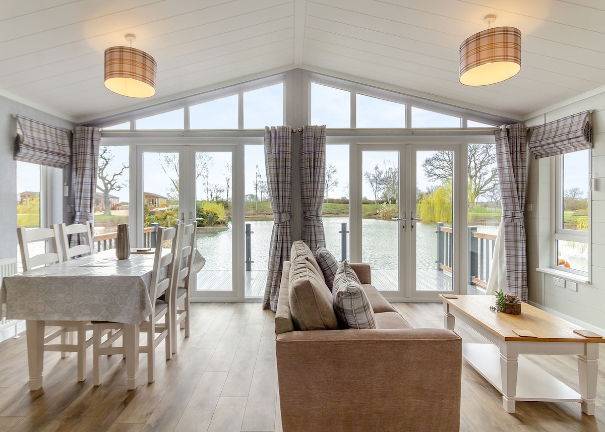 Modern lodge with open-plan living/kitchen/dining area with direct access onto a front decking with bistro set overlooking the fishing lake.
