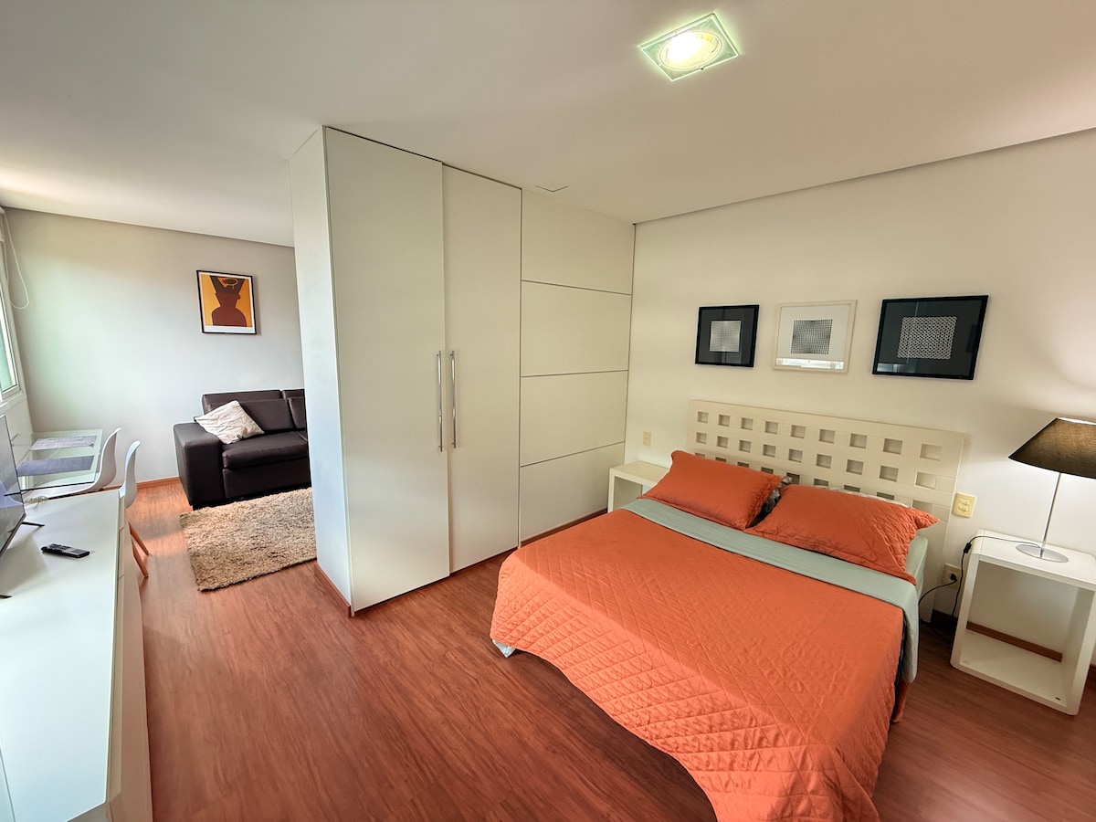 Apartamento moderno, 32m2, ubicado en el mejor punto de Sion. Cocina práctica con minibar, cocina, TV (canales abiertos/Netflix), aire acondicionado, secador de pelo, hervidor eléctrico e internet. Zona Sur, junto a la Plaza JK y la Avenida Bandeirantes, frente a un supermercado. Azotea del edificio con gimnasio, sauna, piscina, sala de estar y cocina comunitaria (agua, máquina de hielo). Limpieza a pedido disponible. Edificio seguro con conserjería las 24 horas. *No hay garaje incluido.