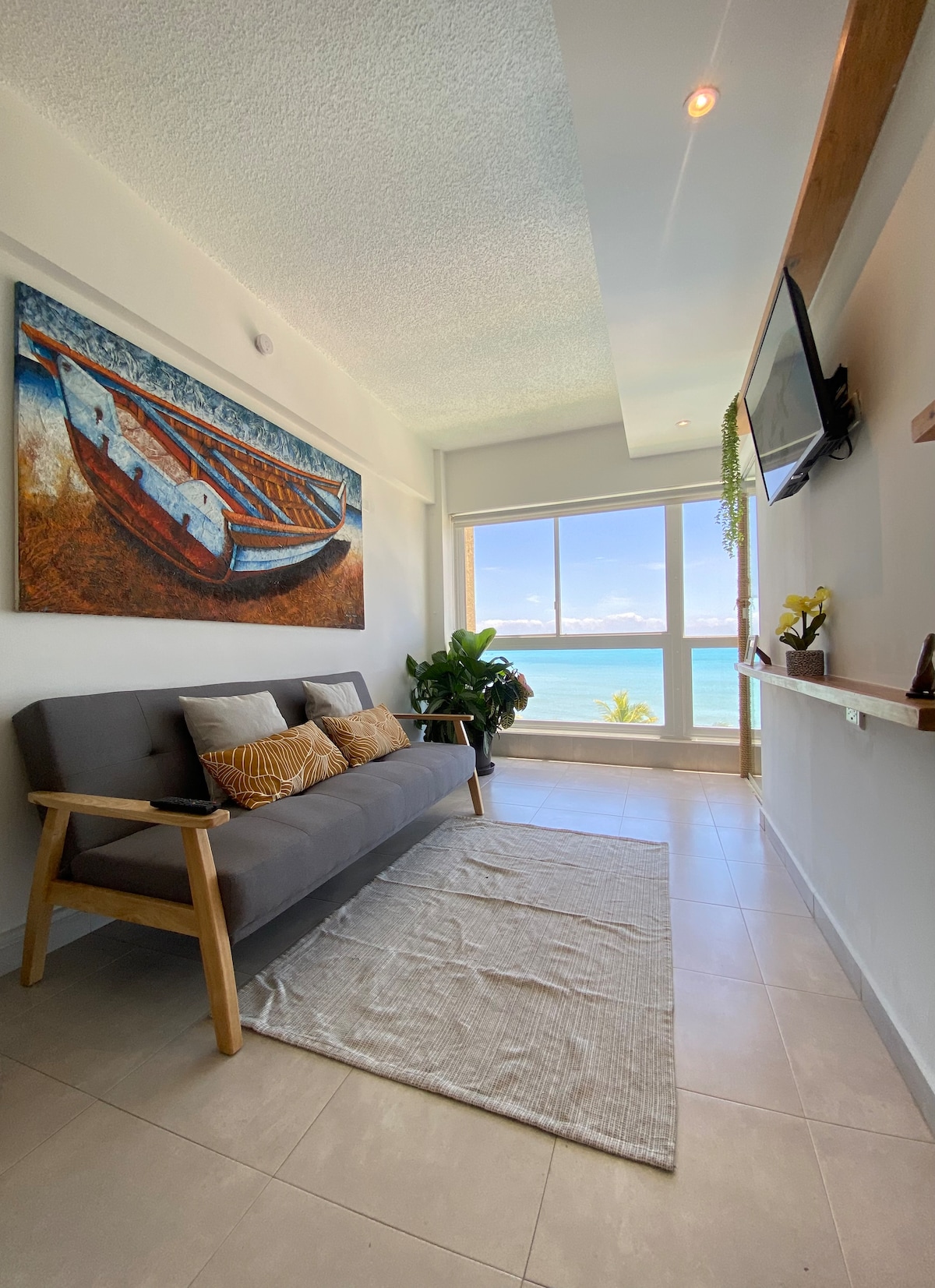 Disfruta del mágico sonido de las olas, la comodidad y la tranquilidad que te brinda este apartamento con hermosa vista al Mar Caribe. Situado en primera línea de playa a pocos pasos del Mar. Ubicado en un edificio tranquilo con piscina y cerca de zonas comerciales, playas y sitios de interés. Dispone de todo lo necesario para que tengas una estancia agradable; Wifi de fibra óptica, cocina equipada, aire acondicionado y agua caliente. El estacionamiento es privado y está dentro del edificio.