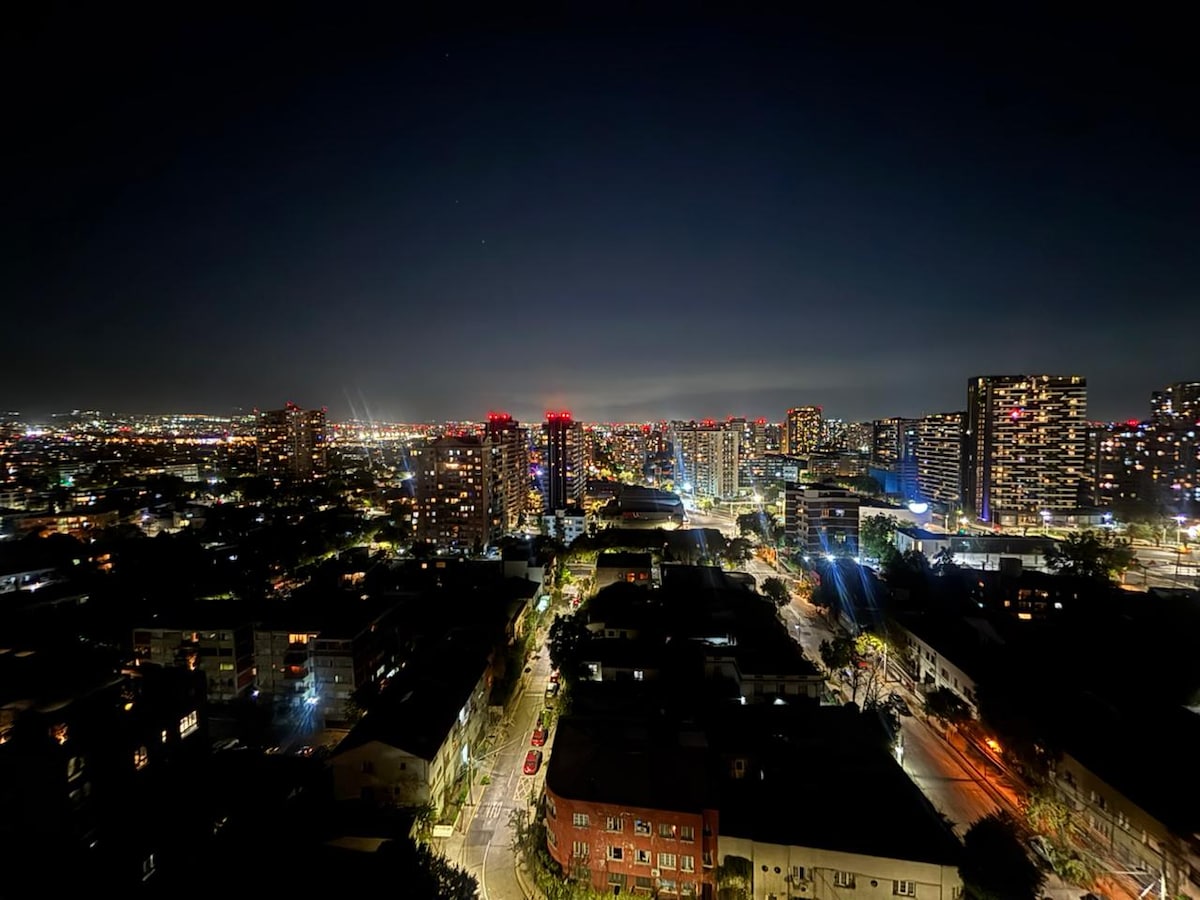 Departamento moderno en piso 24 con increíble vista a la cordillera desde amplia terraza. Capacidad para 5 personas, full equipado con WiFi 600 Mbps, TV (140+ canales), aire acondicionado (frío/calor), cocina completa, lavadora y secadora. Edificio con piscina, gimnasio, quincho y seguridad 24/7. Incluye estacionamiento gratuito. Ubicación estratégica cerca de metro, supermercados y restaurantes. Check-in autónomo. Ideal para turismo o trabajo.