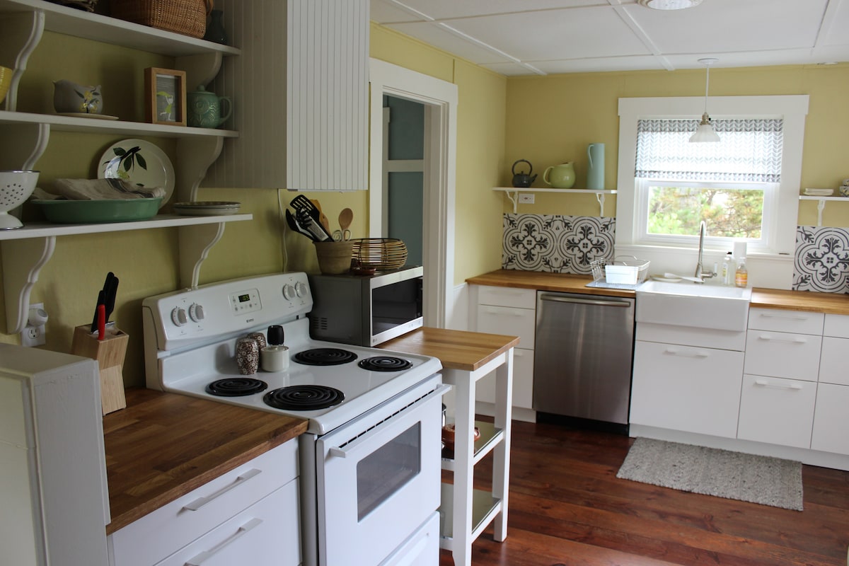 Casa de campo vintage recién remodelada. Llena de luz, encanto y amor. Artística, terrosa, conmovedora. A cinco minutos a pie del mar en un barrio tranquilo. Hermosos terrenos con un patio trasero aislado que da al este para disfrutar de la calidez de la mañana, la luz y el canto de los pájaros. La plataforma delantera y la pequeña terraza de arriba tienen vistas al mar. Cocina equipada con lavavajillas Bosch, nevera grande y nueva y todo lo que puedas necesitar para preparar una cena familiar o un lote romántico de palomitas de maíz. Tienda de comestibles a poca distancia a pie.