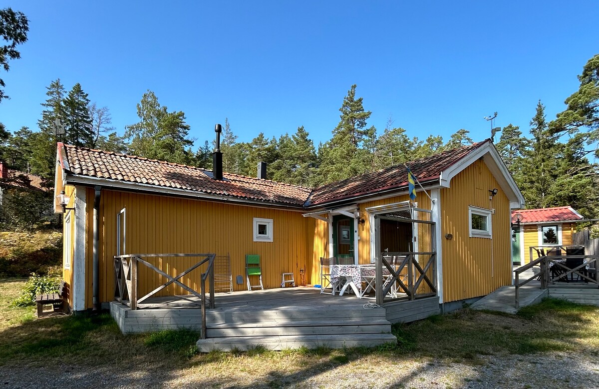 Casa acogedora y fresca con vistas fantásticas y sol todo el día/noche. La casa está situada en lo alto, con un porche que rodea la casa. Vistas despejadas de Horsfjärden. La casa tiene tres habitaciones y cocina. Vistas al lago desde todas las habitaciones. Dormitorio 1 con cama doble, dormitorio 2 con una amplia litera (120 cm en la parte inferior). En las inmediaciones de la casa hay una casa de huéspedes con una amplia litera y un aseo. Cerca de la playa con trampolín, campos de golf, cafetería, restaurante, tienda, barco a Utö. A 30 minutos de Estocolmo en coche. Transporte público eficiente.