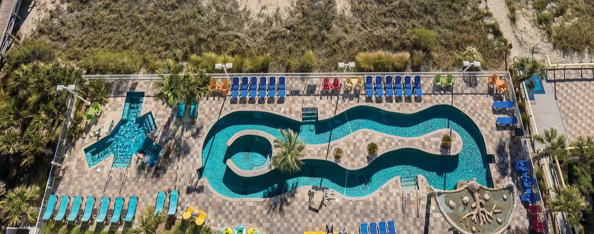 Dear guest, you must be 21 years or older to check in. Discover the charm of Cherry Grove Beach, South Carolina’s top coastal gem, where this sleek, modern resort puts you steps from soft sands and sparkling waves. Spend your days floating down the lazy river or diving into ocean adventures like Jet Skiing and paddleboarding. Catch a sunrise at Cherry Grove Pier, tee off at top golf courses, or comb the beach for seashells and shark teeth.