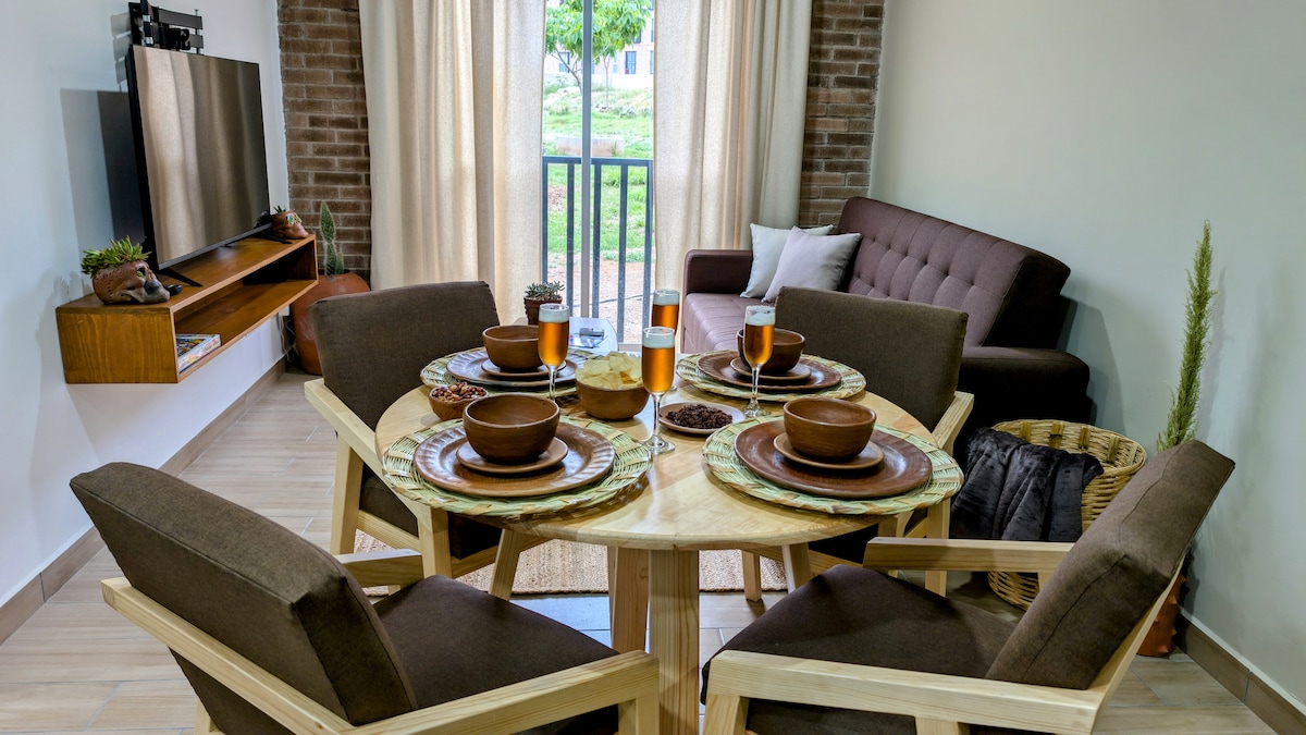 Increíble departamento de un solo piso, estilo étnico contemporáneo, piezas artesanales complementan su original decoración. Diseñado para ofrecer a sus huéspedes una estancia cómoda, funcional y acogedora. Tiene todo lo necesario para hacerte sentir como en casa, con dos encantadoras habitaciones equipadas con camas queen size, sala comedor, baño, cocina equipada y un amplio estacionamiento. Ubicado en un barrio muy tranquilo, a 10 minutos en taxi del centro de la ciudad o 40 minutos caminando.