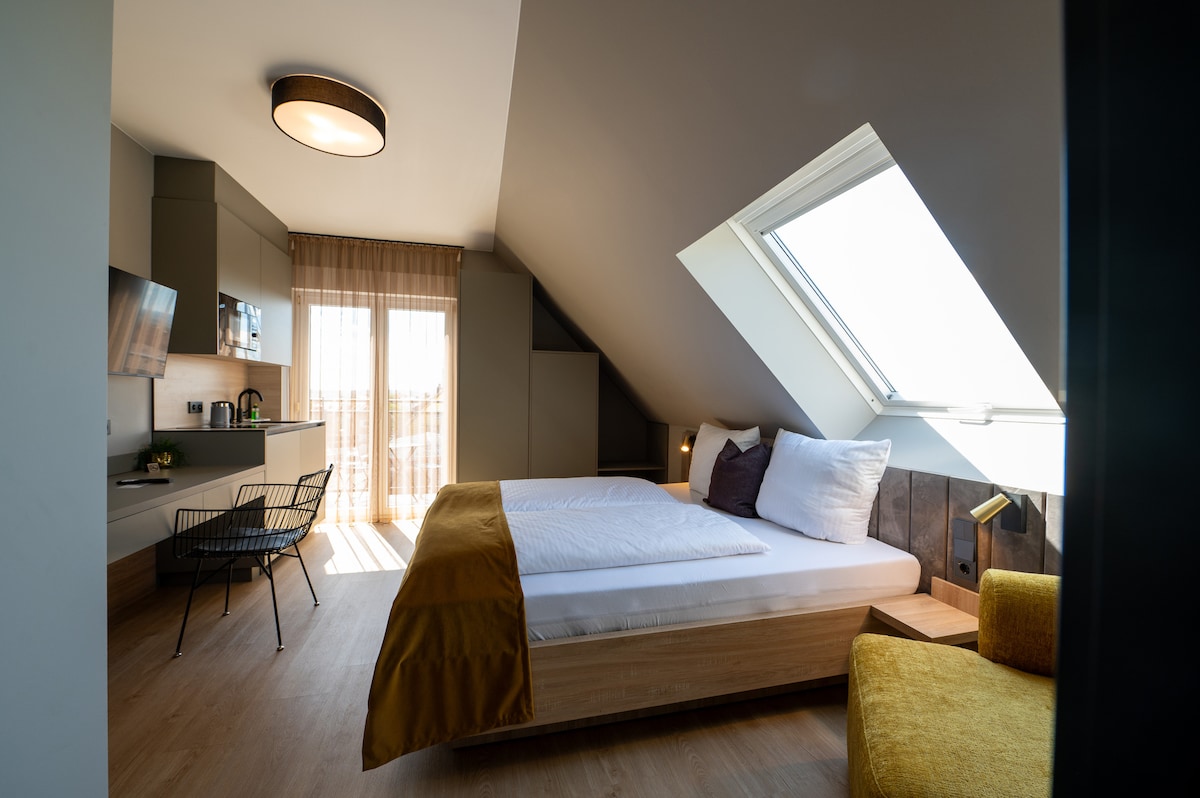 1 cama 180 x 200 cm, 1 baño, 18 - 21 m², 1 - 2 personas Aire acondicionado Calefacción Ducha efecto lluvia con puntas de masaje Baño Calentador de toallas Secadora de pelo Televisión inteligente WIFI Guardarropa Guardarropa Piso de diseño Lámparas de noche Toallas Carpeta digital de invitados