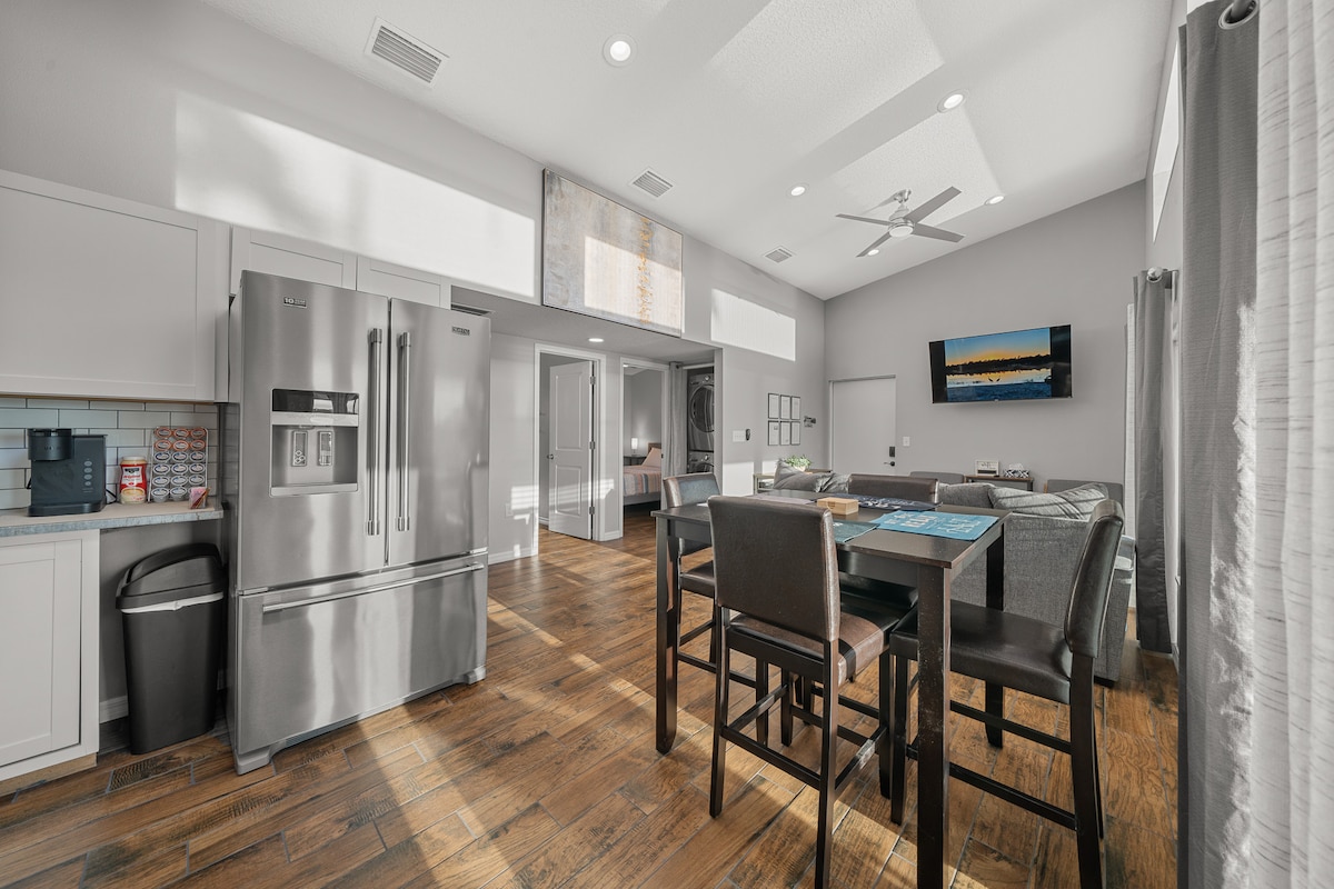 Crea recuerdos con tus seres queridos en esta casa de campo única con un elegante estilo rústico y moderno. Se admiten mascotas, trae a tu amigo peludo y disfruta de la comodidad. Este es un complejo familiar cerrado de madera. Cada casa es privada, rodeada de hermosas áreas comunes. Rodeado de muchos manantiales naturales y también de los restaurantes locales como «Gators Joes Beach Bar & Grill» a solo 6 metros a pie, a 6 metros a pie del lago Weir y más.