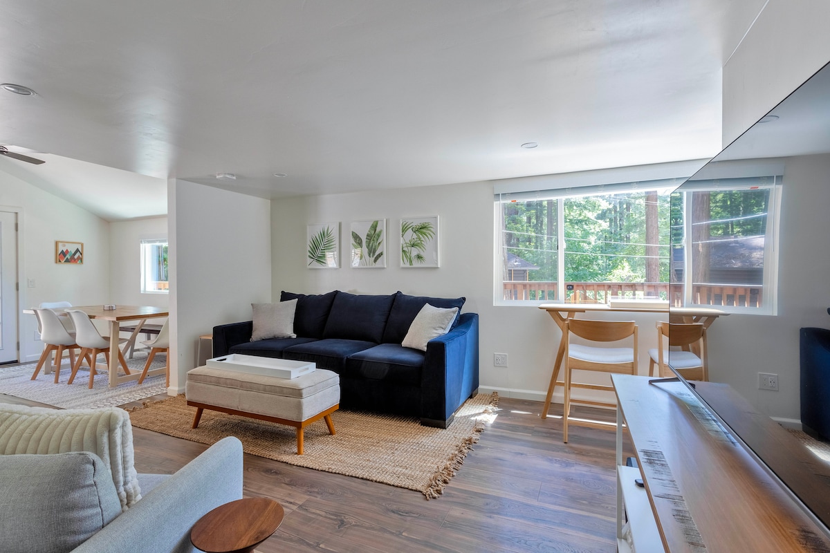 Si buscas un retiro tranquilo y lleno de naturaleza, con wifi rápido, no busques más. Zen House es la escapada de vacaciones perfecta. Luminosa y espaciosa, con ventanas por todas partes y una vista espectacular de las secuoyas. Estás a menos de diez minutos en coche de la playa. La propiedad está en 3 acres con más de 100 secuoyas demasiado grandes para abarcar con los brazos. Las grandes cubiertas, el patio y los caminos de piedra, el jacuzzi y la parrilla se suman a la oportunidad de bañarse en el bosque y disfrutar de la belleza al aire libre.